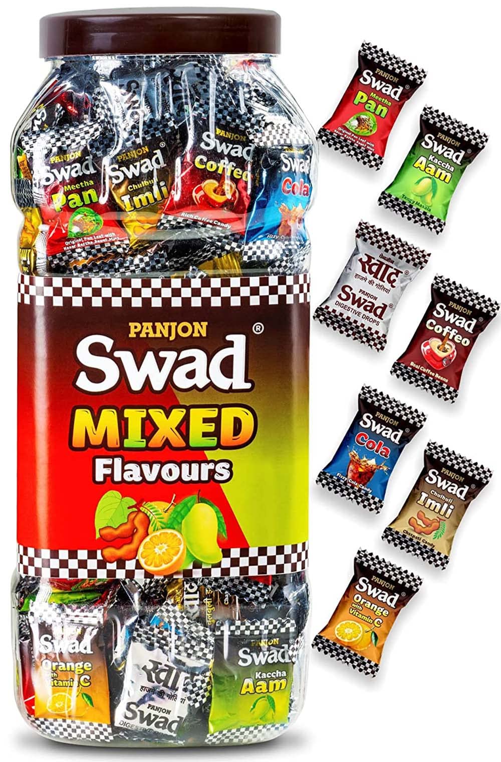Product Description Swad digestive drops is now available in 4 new mouth watering flavours with centre chatpata masala filling: Swad kaccha aam Swad imli Swad lemon and Swad guava candies (along with the original Swad digestive candy). You can order them. Each flavour is power packed with digestive and ayurvedic ingredients which give it a unique taste. Swad is a delicious and tingling candy that's fun to have at any time of the day. What's more it is a great treat to your stomach too. Swad is a product that is universally relished by people of all ages. Swad 's khatta meetha taste is the best way to enjoy while staying healthy. This ayurveda-based candy is purely made of herbal ingredients which give it a unique blend of taste and health. Swad digestive drops comes in convenient pillow packs and is the perfect way to complete your daily meal. Swad has been a proud brand of Panjon ltd. And enjoys a tremendous place in every Indian's heart. Living its most popular slogan chahe jitna bhi khao Swad se pachao from grandfathers to grandchildren Swad is a family's favourite candy. Store in a cool and dry place away from sunlight/ humidity. From the Manufacturer Swad Original & Mixed Chocolate Candy (Aam Imli Pan Coffee Cola Orange Vitamin C) Jar 150 Toffees
