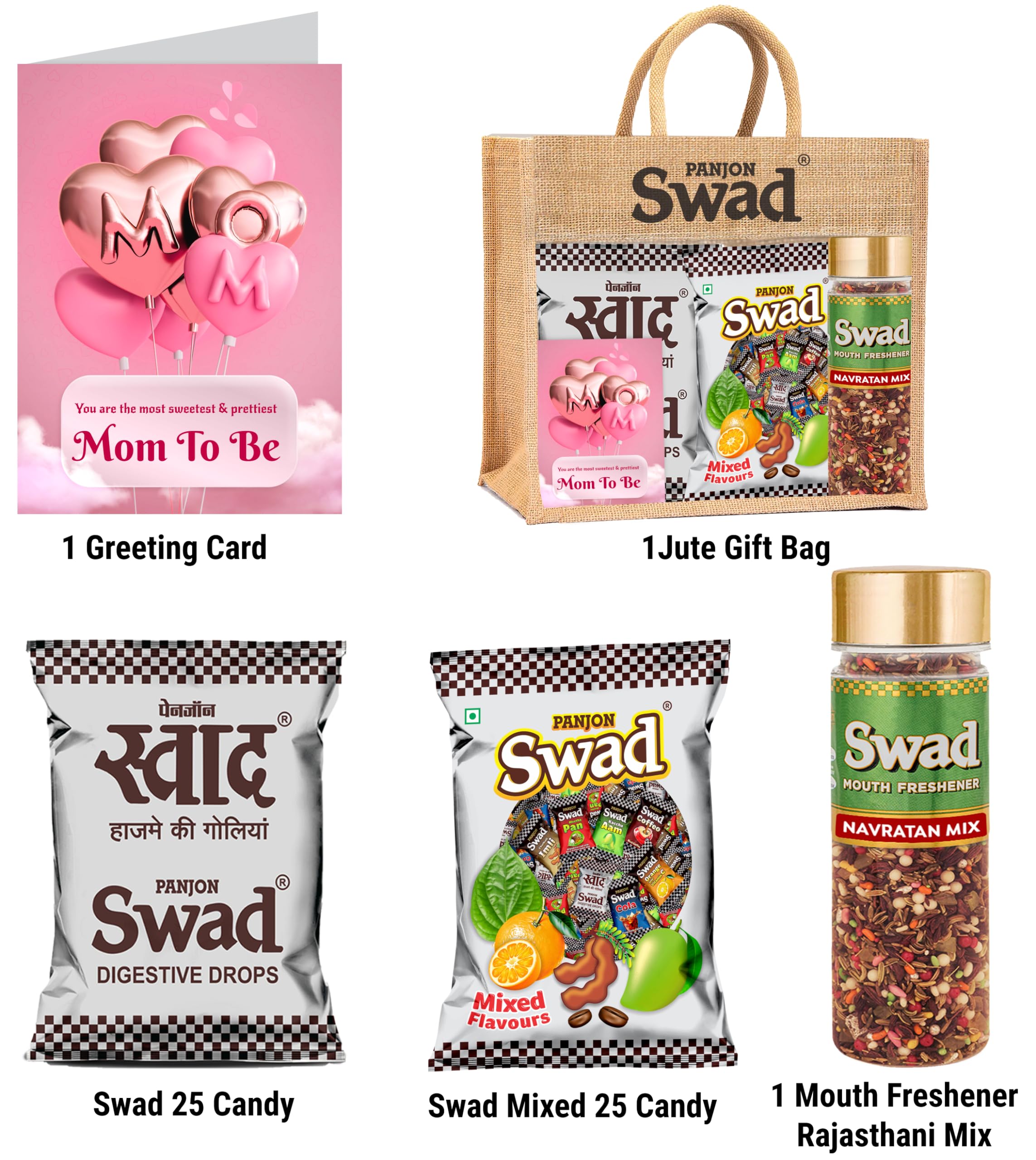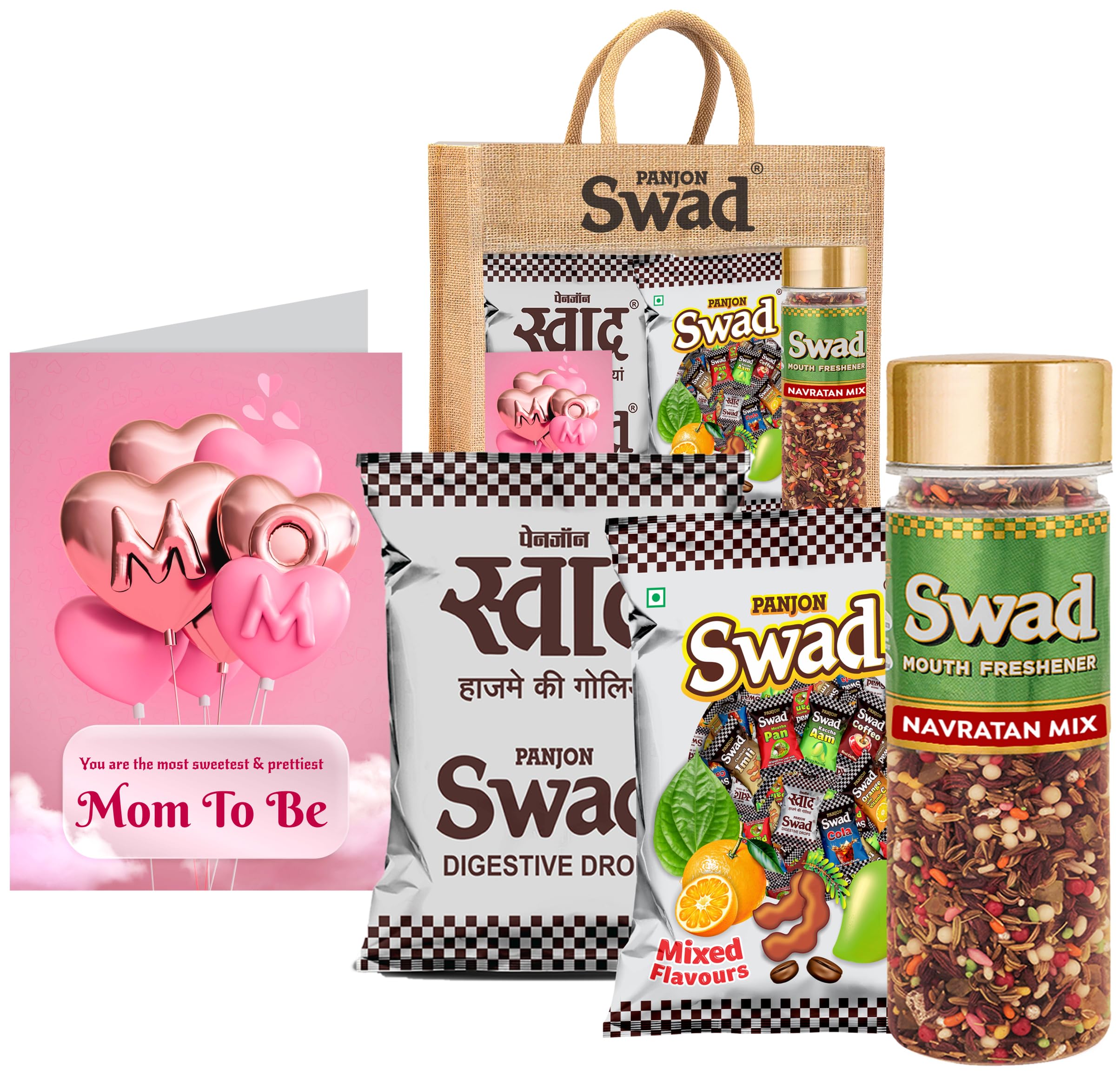 Swad Mom To Be / New Mother / pregnant Gift with Card (25 Swad Candy 25 Mixed Toffee Navratan Mix Mukhwas) in Jute Bag Mom To Be New Mother pregnant Gift with Card hamper gifts best unique for greeting message customised customized personalised personalized candy toffee fragrance scent perfumeSwad Trust Since 1986: India's favourite Digestive confectionery candy brand since 1986. A quality product by Panjon Limited.Swad Candy & Mukhwas Mouth fresheners range is made of ayurvedic herbal & digestive ingredients. Swad candy flavours: Kaccha Aam Meetha Pan Imli Cola Coffee & Orange with Vitamin C chocolates mix.Try all Swad Mouth fresheners: Mukhwas Paan Anardana Imli Khajoor Amla Aam Papad Saunf & Navratan Mix.