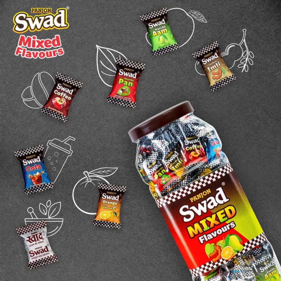 SWAD TRUST SINCE 1983: Swad is India's favourite Tasty & Digestive confectionery candy brand. Swad Candy is made with best quality ingredients. Swad Candy now comes in new flavours: Kaccha Aam Meetha Pan Chulbuli Imli Cola Coffee & Orange with Vitamin C.