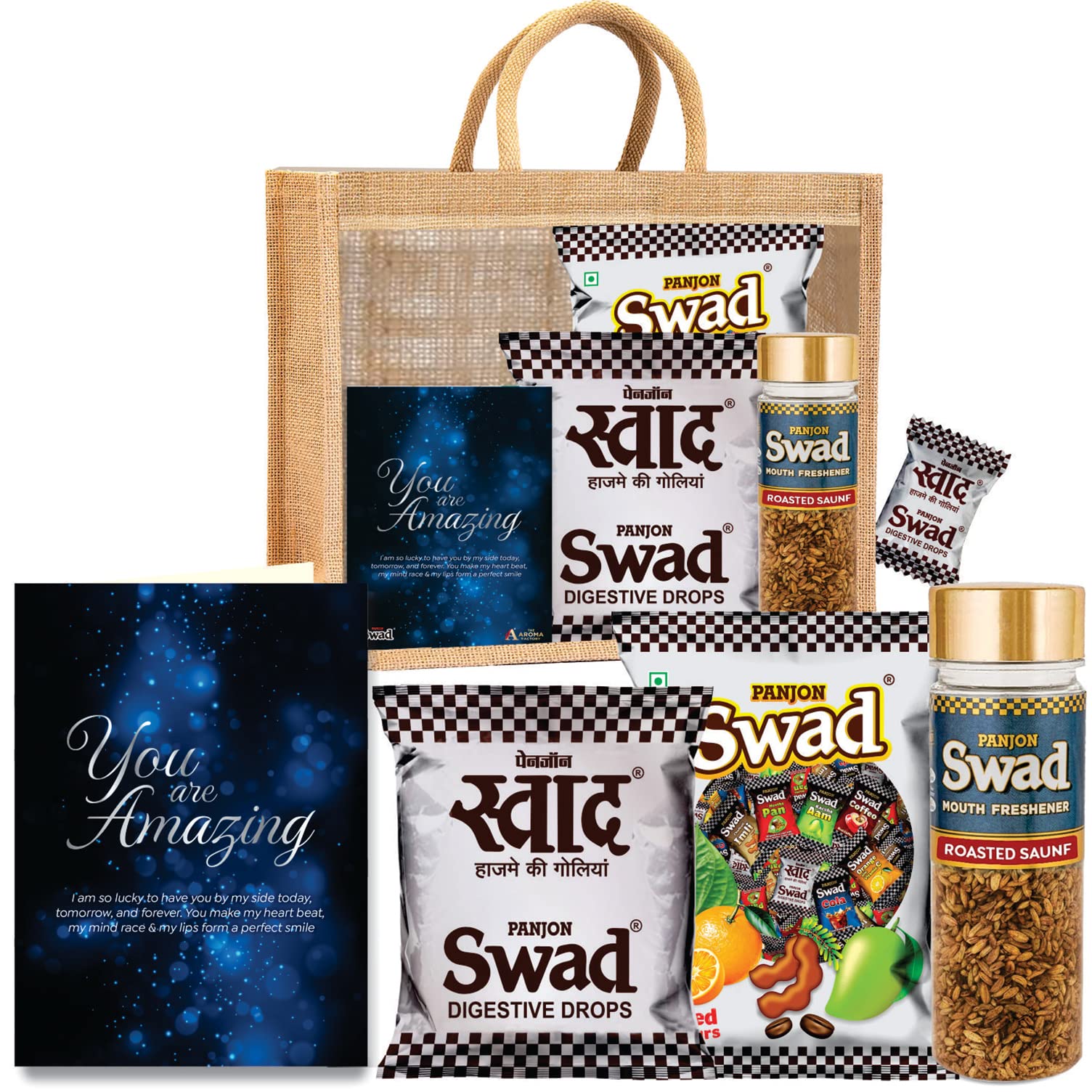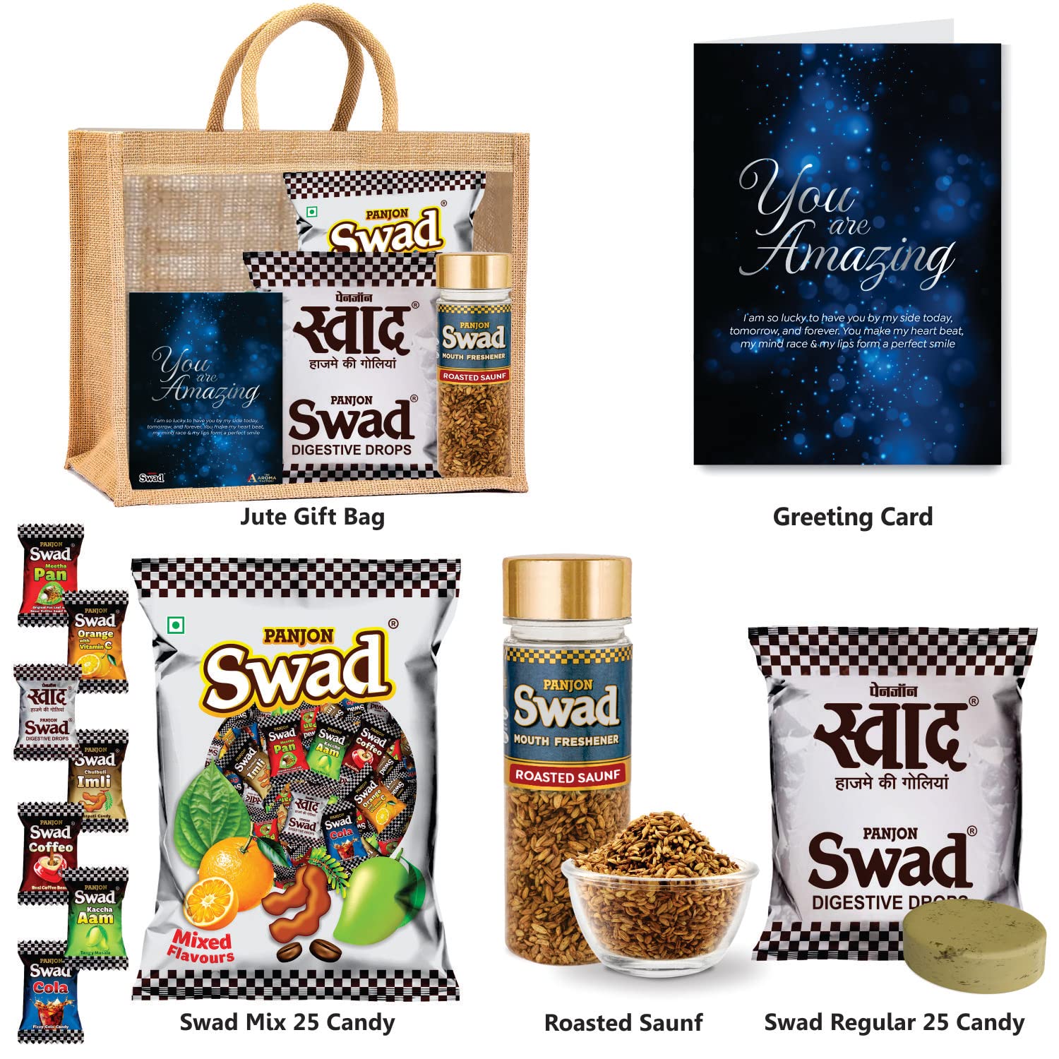 Swad You are Amazing Gift Hamper Set (Mixed Toffee & Rosted Saunf & Regular 25 Candies Packet Pachak Mukhwas Mouthfreshener 25 Candy & 2 bottle) with Greeting Card & Jute BagGift Item