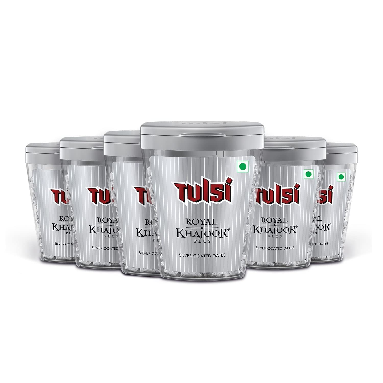 Tulsi Royal Khajoor Plus | Pack of 6 (30g x 6) | Silver Coated Khajoor | Dates| Mint Mouthfreshner Jar | Flip Top Pack
