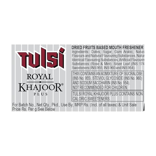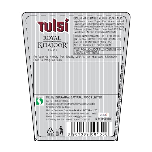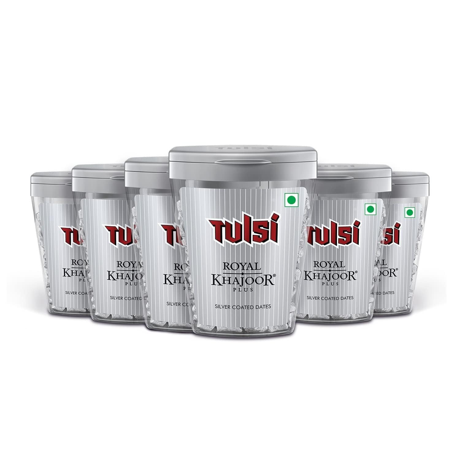 Tulsi Royal Khajoor Plus is a Mouthfreshener made of handpicked premium quality dates coated with pure silver leaves. It is a perfect blend that gives an irresistible experience of mint taste freshen up the mouth and with added health benefits of Khajoor. It is one of the unique and first of the kind innovation when a Khajoor has been offered in hygienic and superior form with attractive packaging.