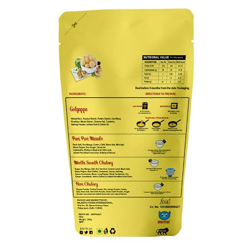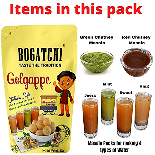 BOGATCHI Golgappe Pani Puri will become your favourite snack once you taste it. We believe in Simple good food that's why our gol gappe is made of best natural ingredients. To have full chatwala experience the packet includes 4 waters masala green and red chutneys. These ready to fry atta golgappe can be made within a minutes. The quality is good. We offer clean and air-tight pani puri packets for keeping golgappa puris fresh and not loosing their taste.