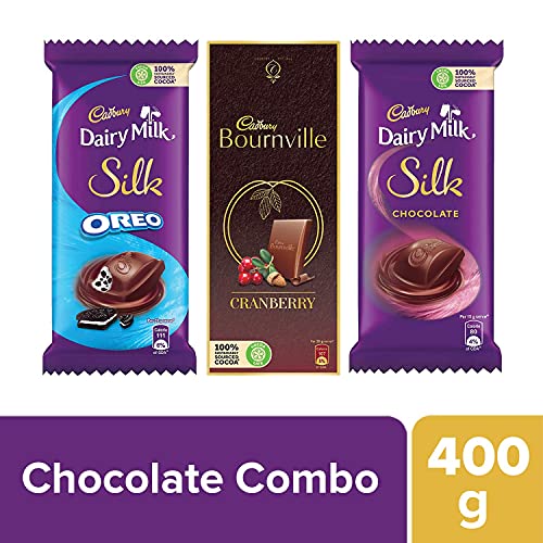 Cadbury is all about regaling in the chocolate's richness and creaminess. It offers you the reason to celebrate every small and big occasion of happiness. In short indulge in a rich smooth and creamy celebration. This combo comprises 2 packs of Cadbury Dairy Milk Silk 60g 2 packs of Cadbury Dairy Milk Silk Oreo 60g & 2 packs of Cadbury Bournville Cranberry 80g.