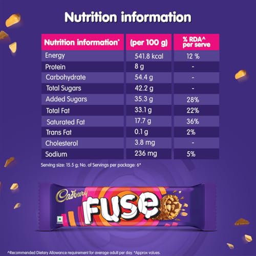 Cadbury Fuse is a crunchy chocolate feast that will satisfy and stimulate your taste buds with its rich taste filled with nuts & caramel. It has a creamy centre coated in smooth Cadbury milk chocolate. This chocolate bar is a perfect sweet to indulge in all alone or as a chocolate pack for gifting on special occasions like birthdays and get-togethers. Every bar of this crunchy chocolate is made from 100% sustainably sourced cocoa. It is suitable for vegetarians.