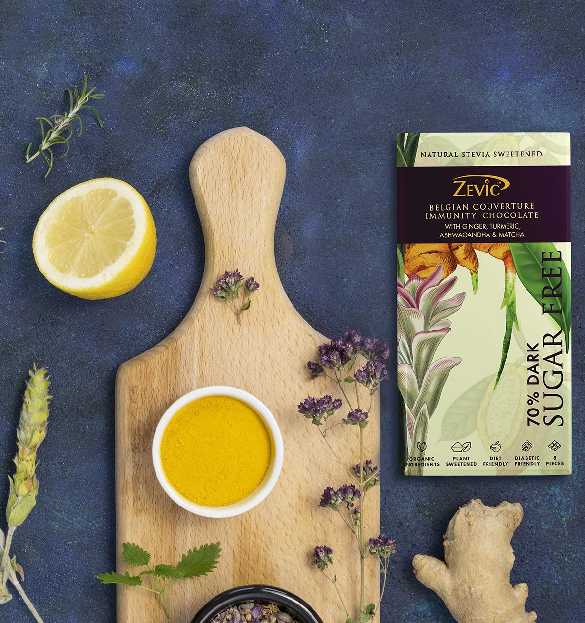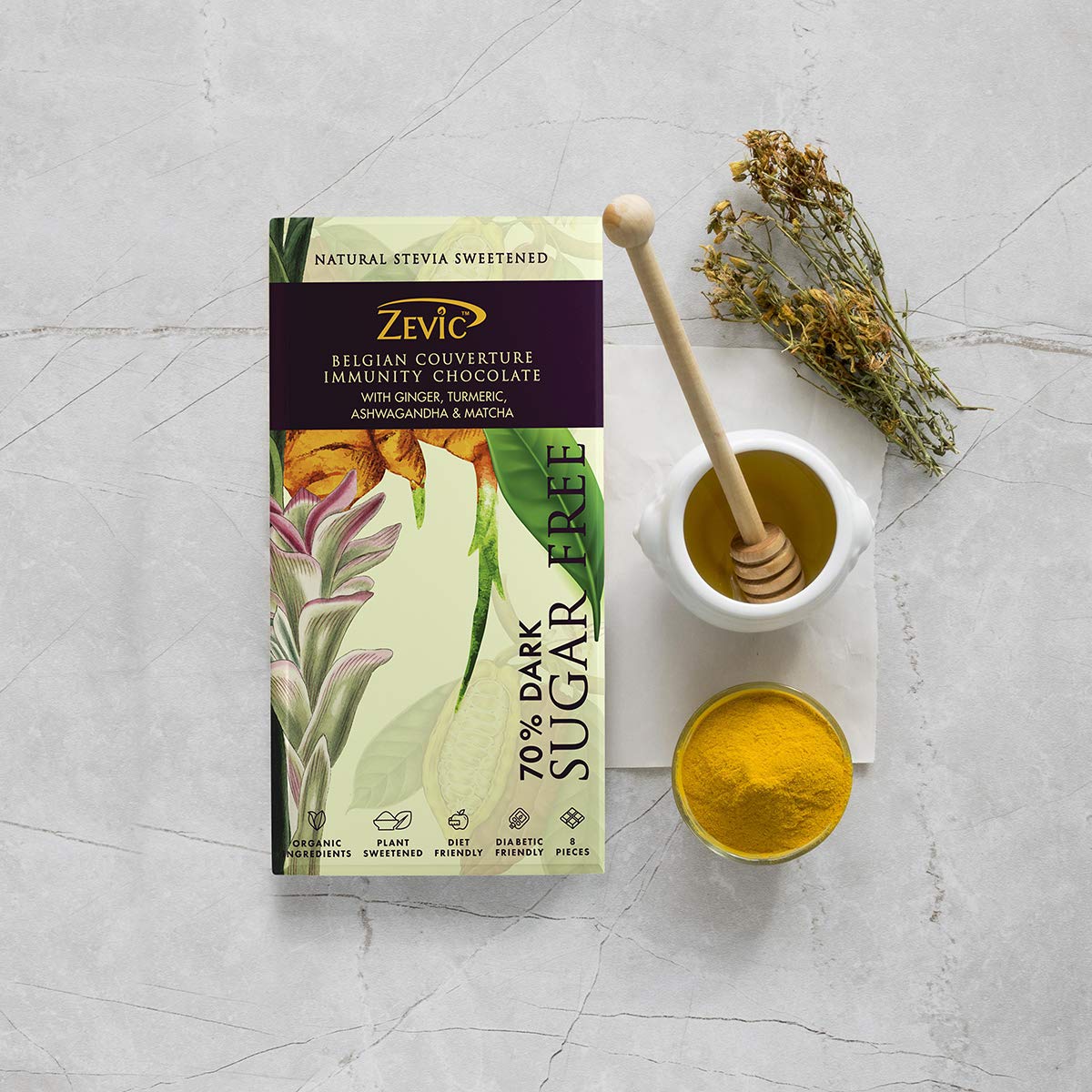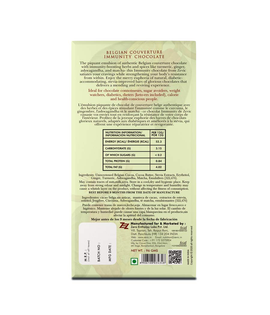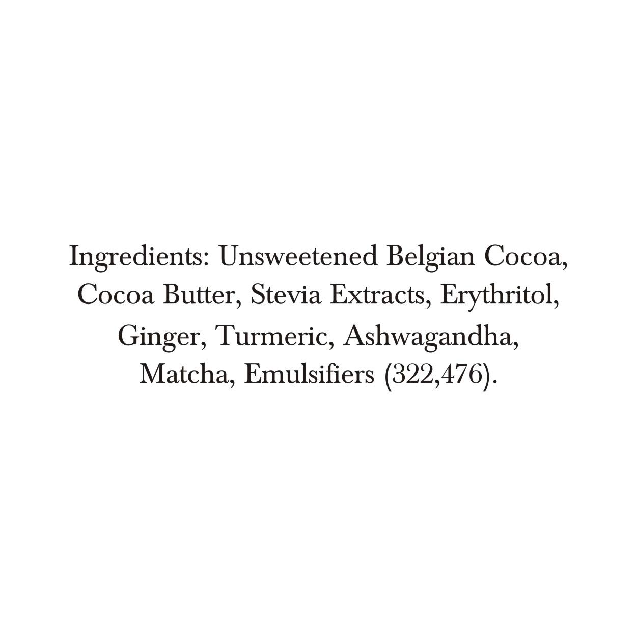 Savour the guilt-free heavenly match of Belgian couverture chocolate and handpicked Ashwaganda ever healing turmeric & anti oxidants rich Matcha. The sacred combination of in dark chocolate sweetened by the natural zero-calorie in all its rich melody and freshness is sure to render you obsessed!