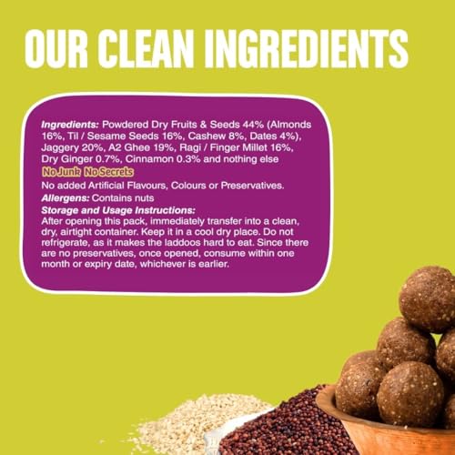 100% CLEAN INGREDIENTS: Our Ragi Til Laddu with Jaggery is crafted with the finest quality A2 Ghee Jaggery and a premium selection of dry fruits ensuring purity in every bite.