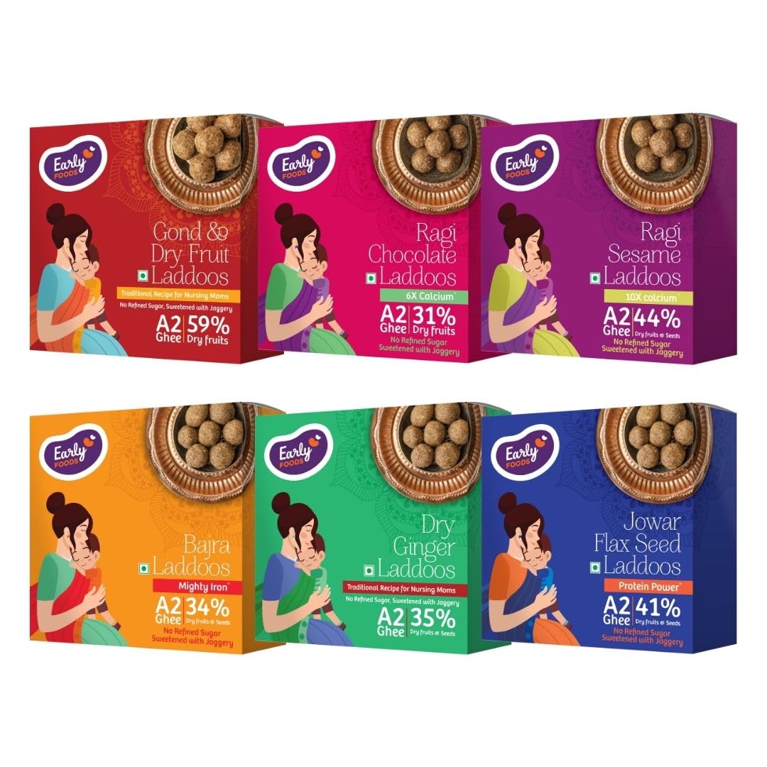 Early Foods - Pack of 6 Laddoos | Gond & Dry Fruits, Ragi Sesame, Ragi Choco, Dry Ginger, Jowar & Bajra Laddoos | Sugar Free Laddu | Sweetened with Dates | Laddoos for Kids & Moms | A2 Ghee Laddoos