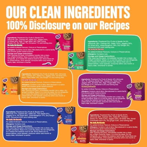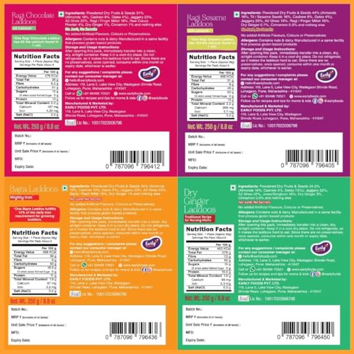 1. Gond & Dry Fruits Ladoos 250g 2. Dry Ginger Laddoos 250g 3. Ragi Sesame Ladoos 250g 4. Ragi Chocolate Ladoos 250g 5. Jowar Flax Seeds Ladoos 250g 6. Bajra Ladoos 250g