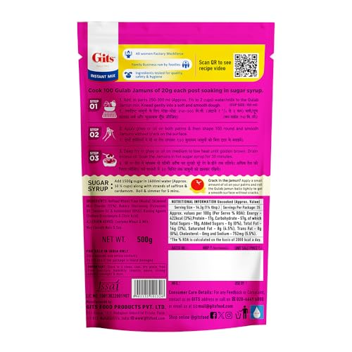 This Gits Instant Gulab Jamun Dessert mix is formulated using the best recipes to make sure that you end up with soft and juicy Gulab Jamuns that melt in your mouth. The 500-gram pack of this Gulab Jamun mix can provide up to 100 delicious Gulab Jamuns for a big family gathering. For best results it is recommended that the instant mix powder be mixed with water made into a soft dough fried in pure ghee and soaked in sugar or sweet syrup for at least 30 minutes. Since this is a 100% vegetarian preservative-free and artificial colours and flavor-free mix it is a great addition to your kitchen for unexpected guests and special occasions. Add some vanilla ice cream to a bowl of Gulab Jamuns and feel the wonderful combo of flavours. Gits dessert ready mixes are made using the finest ingredients and with the suggested recipes you can make fantastic homemade Indian mithais. A 3-generation family-owned business Gits can help you make perfect delicious and flavour-filled Indian sweets and savouries.