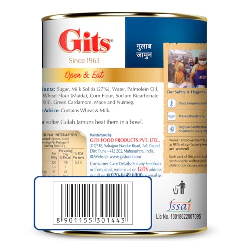In the Ready to Eat Indian sweets category Gulab Jamun outclasses every other delicacy. At the top of this game is Gits Open & Eat Gulab Jamun that brings the traditional and tasty mithai in highly convenient tin cans. Itâs a pure vegetarian dessert that is made from fresh khoa sugar wheat flour corn flour green cardamom and nutmeg. Made with the highest standards of quality this sweet is filled with syrup right after production and transferred instantly to the tin can which preserves the freshness and taste for up to 8 months. It is recommended to heat the Gulab Jamuns before consumption. Whether youâre looking to sharing it with friends to celebrate an occasion or simply want to indulge yourself on a cheat day Gits Gulab Jamuns are the perfect pick! Gits desserts are cooked with the best quality ingredients and are packed carefully in boxes that keep the contents fresh and ready to eat. Gits has been touching the lives of millions of families across the world by bringing forward tasty sweets and savouries that leave customers longing for more.