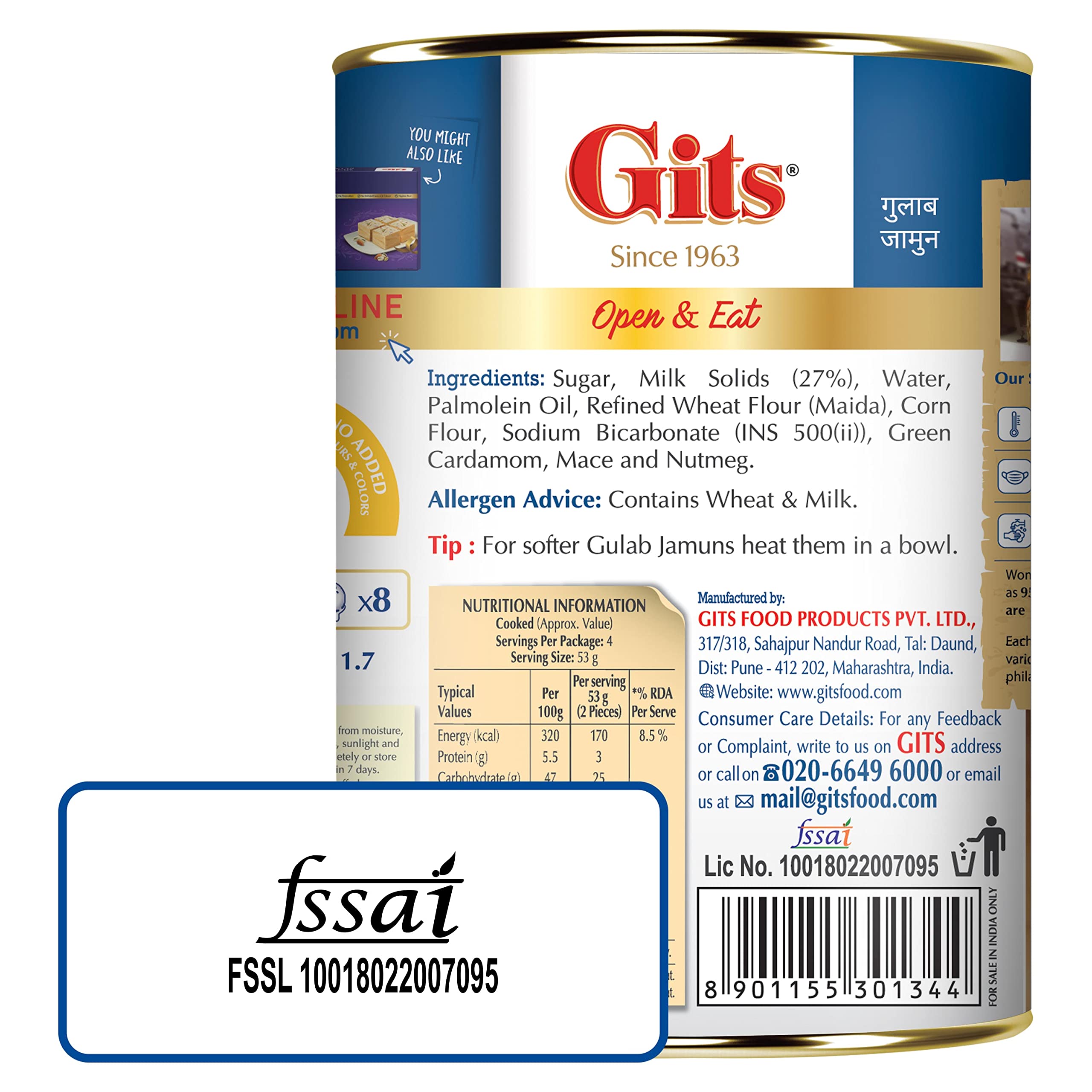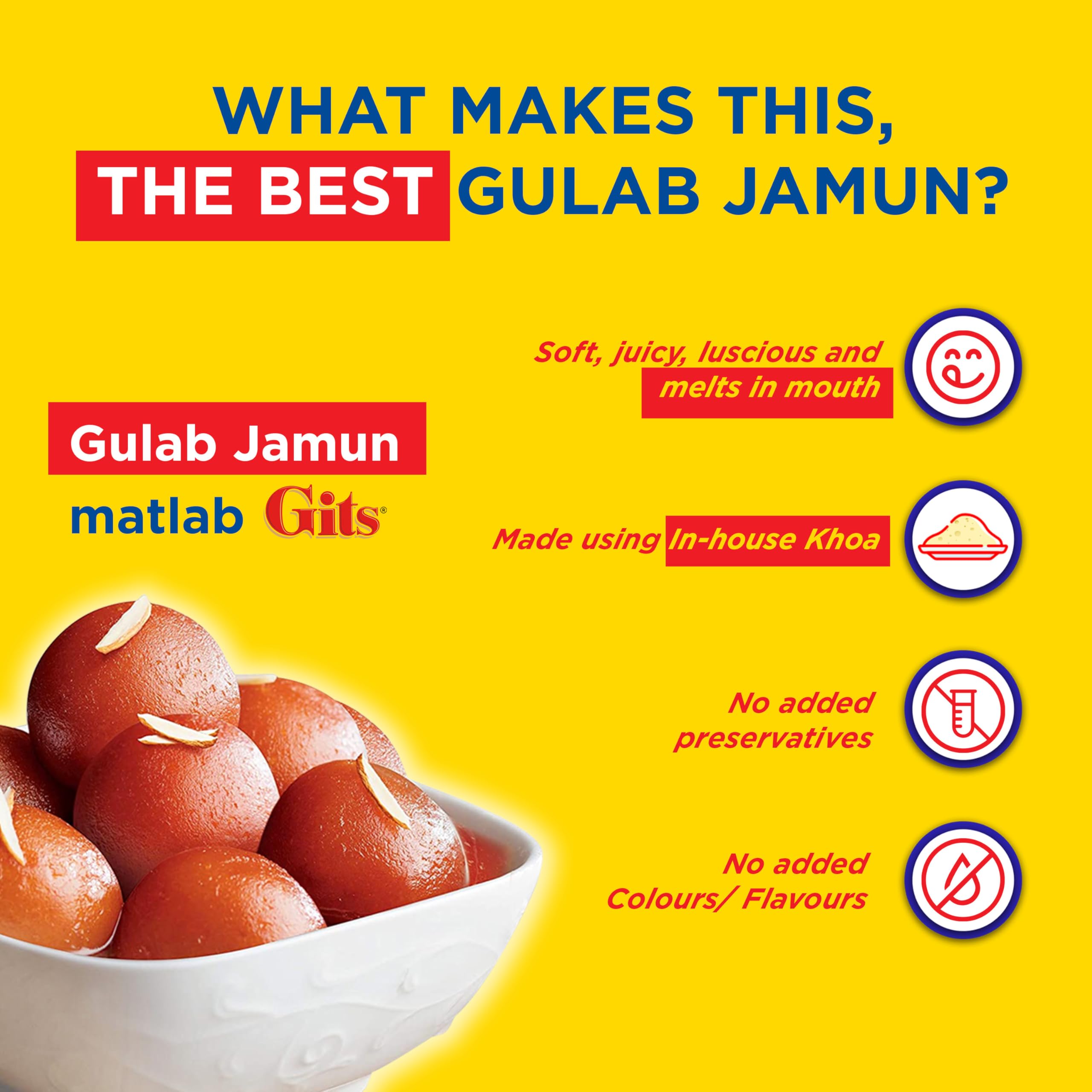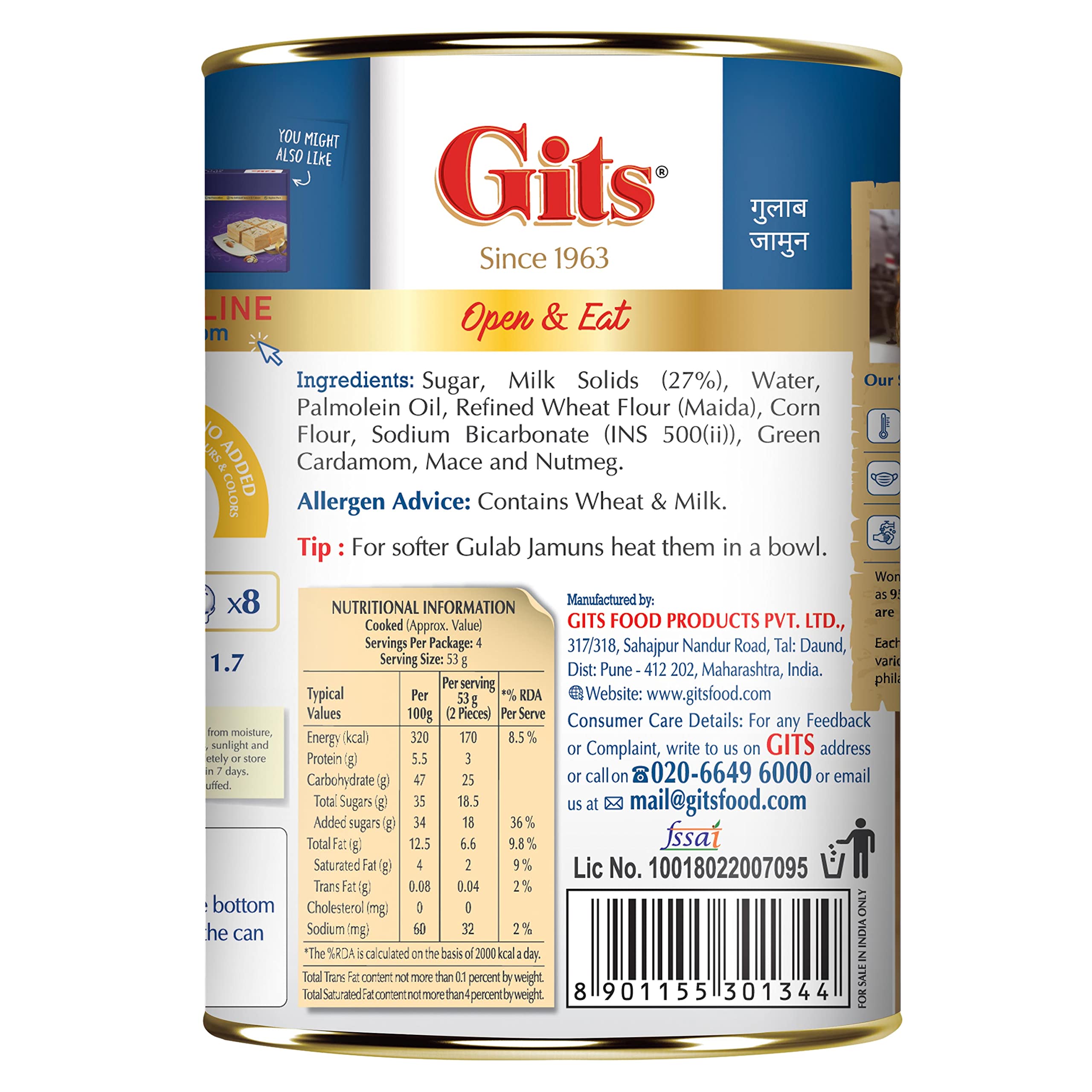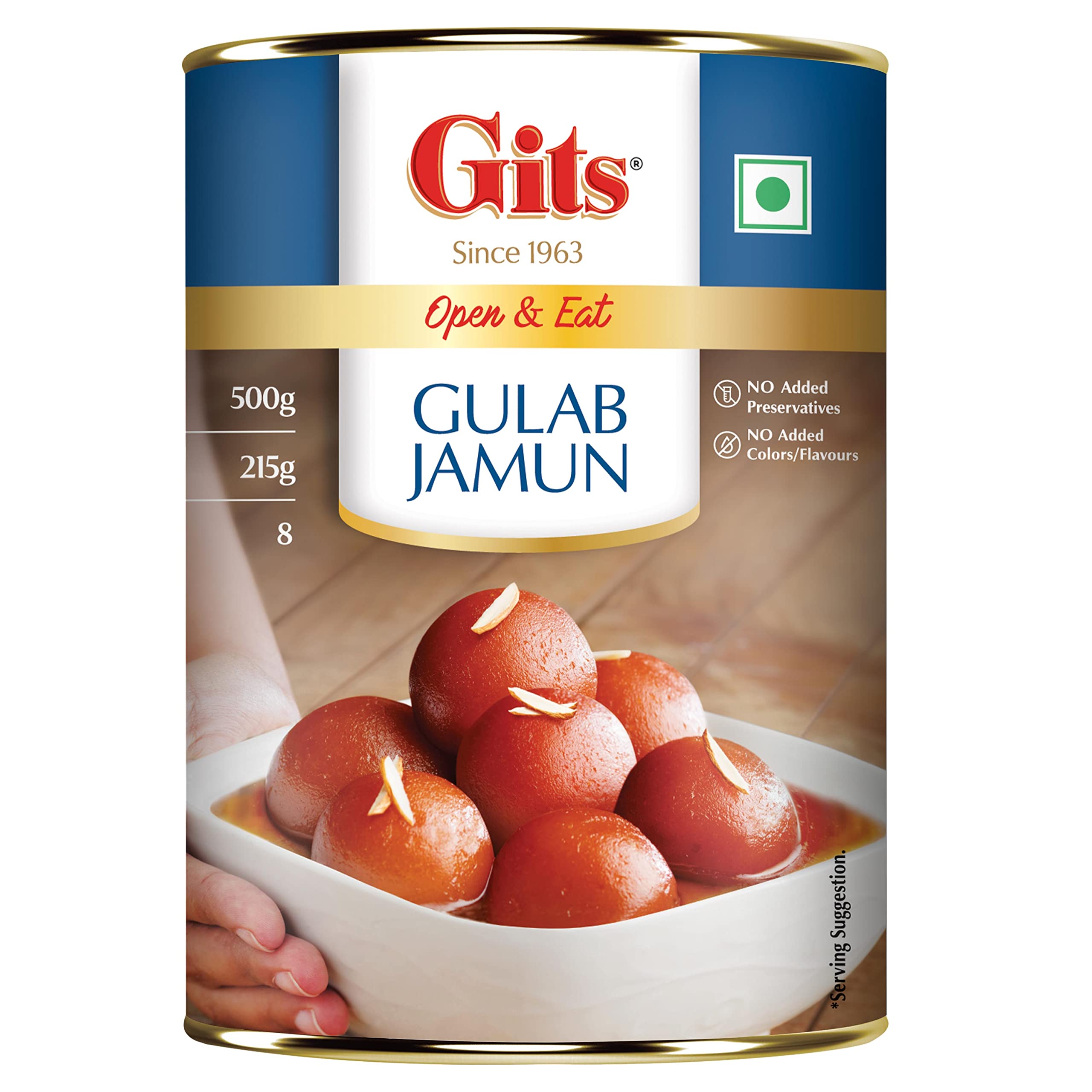 In the Ready to Eat Indian sweets category Gulab Jamun outclasses every other delicacy. At the top of this game is Gits Open & Eat Gulab Jamun that brings the traditional and tasty mithai in highly convenient tin cans. It's a pure vegetarian dessert that is made from fresh khoa sugar wheat flour corn flour green cardamom and nutmeg for a flavourful taste. Made with the highest standards of quality this sweet is filled with syrup right after production and transferred instantly to the tin can which preserves the freshness and taste for up to 8 months. It is recommended to heat the Gulab Jamuns before consumption. Whether you're looking to sharing it with friends to celebrate an occasion or simply want to indulge yourself on a cheat day Gits Gulab Jamuns are the perfect pick! Gits desserts are cooked with the best quality ingredients and are packed carefully in boxes that keep the contents fresh and ready to eat. Gits has been touching the lives of millions of families across the world by bringing forward tasty sweets and savouries that leave customers longing for more.
