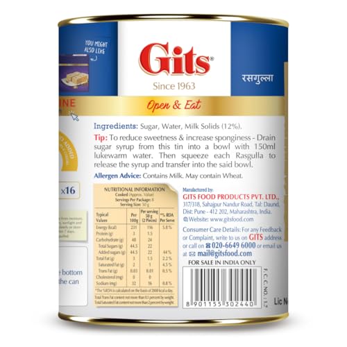 Be prepared to take your taste buds on a journey of authentic Bengali sweets with the Gits Ready to Eat Rasgulla. Fondly known as âRoshogollasâ and made from very simple ingredients - 100% freshly prepared Chhena Sugar and Water and without preservatives artificial flavours or colours. The Chhena is prepared from milk sourced from the best cow farms and rolled into ball-shaped sweets to leave you finger-licking. If you wish to reduce the sweetness drain the sugar syrup into a bowl with 150ml lukewarm water. Squeeze the syrup out of each Rasgulla and serve. These Indian mithais have become very popular in the packed sweets category and are enjoyed best with friends and family on occasions festivals and celebration days. Gits desserts are cooked with the best quality ingredients and are packed carefully in boxes that keep the contents fresh and ready to eat. Gits has been touching the lives of millions of families across the world by bringing forward tasty sweets and savouries that leave customers longing for more.