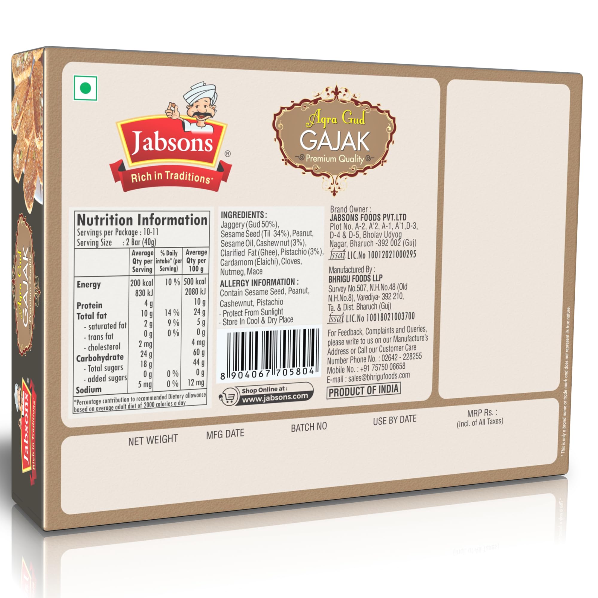• Crafted with the finest quality jaggery sesame seeds peanuts and more JABSONS Gud Gajak is a treat for your taste buds.