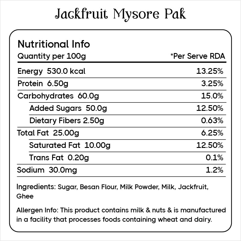 Experience a unique fusion of tradition and flavor with Jackfruit Mysore Pak a delightful twist on the classic Indian sweet. Made with pure ghee gram flour sugar and the natural goodness of jackfruit this Mysore Pak offers a soft melt-in-the-mouth texture with a hint of fruity richness. Handcrafted to perfection this special variant of Mysore Pak is perfect for festivals gifting or simply indulging in a luxurious sweet treat. Its rich aroma and distinctive flavor make it a standout addition to any occasion.