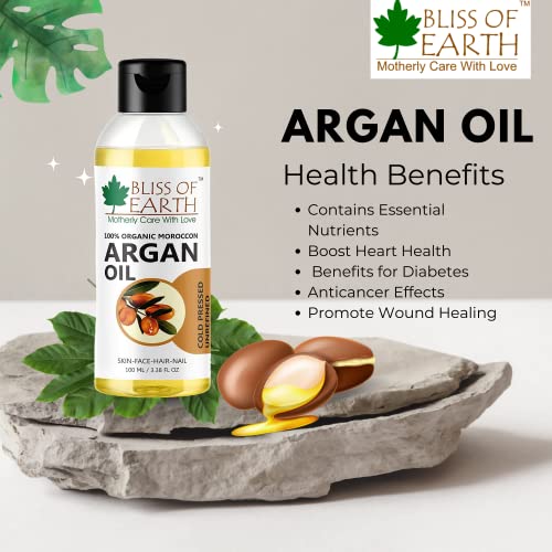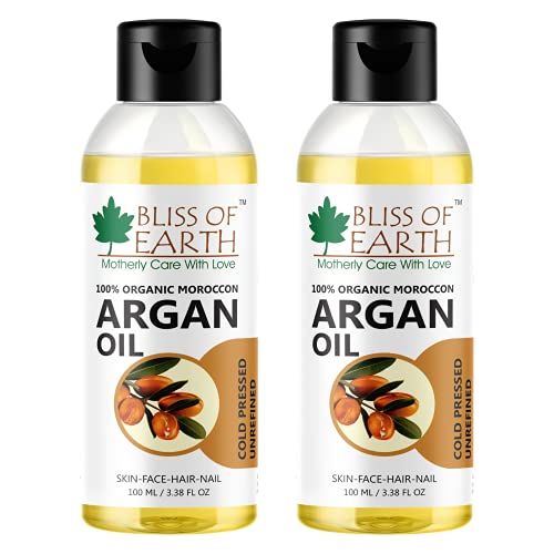 Bliss of Earth Argan Oil is 100% organic cold pressed & hexane free with no added chemical or preservatives. It is extracted from kernels of Argan tree native to Morocco. It is rich in anti oxidant Vitamin AC& E and Omega 6 which promotes healthy skin and hair. Argan oil is multi-functional oil beneficial for all skin types due to its rich fatty acid content.: It reduces sebum level and treats acne.Vit E & fatty acid of Argan oil repairs damaged skin prevents dryness and irritation.Argan oil helps to prevent hair loss and even helps to promote new hair growth.It helps to promote stronger and healthier nails naturally.It is a natural moisturizer. Rub a drop into dry lips.