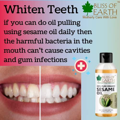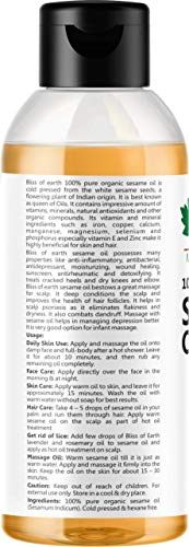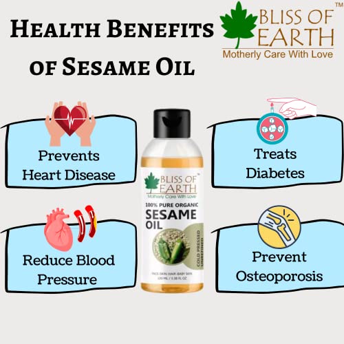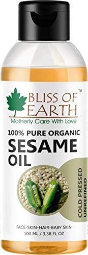 Size:100 ml (Pack of 1)Bliss of earthandtrade 100 percent organic sesame oil 100ml. Cold pressed and unrefined- finest quality therapeutic grade oils - ideal for complete beauty regime bliss of earthy these oil has a fresh natural aroma which is relaxing restorative and refreshing. It's gives a relax feeling to your muscle and mind too and these oils help to keep your hair and skin healthy it's a complete combo for your body it's makes your body healthy and shiny sesame oil: Sesame oil is rich in natural vitamins a e and b antioxidants as well as essential fatty acids like linoleic acids stearic acids and palmitic acids that makes it effective for skin care and hair care. Regular massages may help to diminish the appearance of scars stretch marks wrinkles etc benefits: Bliss of earthy perfect inclusion for anti aging formulas because of its palmitoleic acid content these oil help to relax muscle aches it's makes you stress free and acts as insect repellent. It may help reduce wrinkles and brighten the complexion sesame oil is easily absorbed into the skin and helps skin to retain its moisture bleed-free it may be helpful to combat against acne eczema inflammation general redness and irritation of the skin.
