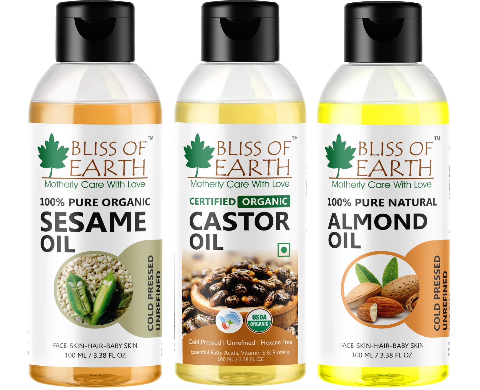 Bliss of Earth¢ Combo of 100% Organic Sesame Castor & Sweet Almond Oil (Pack of 3) 100ML Each Coldpr