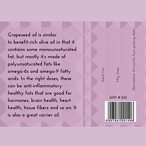 Grapeseed oil is loaded with vitamin E and polyunsaturated fats. It has various of benefits for health skin and even hair. It is a natural oil without any chemicals. It is known to be antiviral anti-inflammatory anti-bacterial. It is rich in vitamins proteins minerals as well. It works great as a carrier oil.