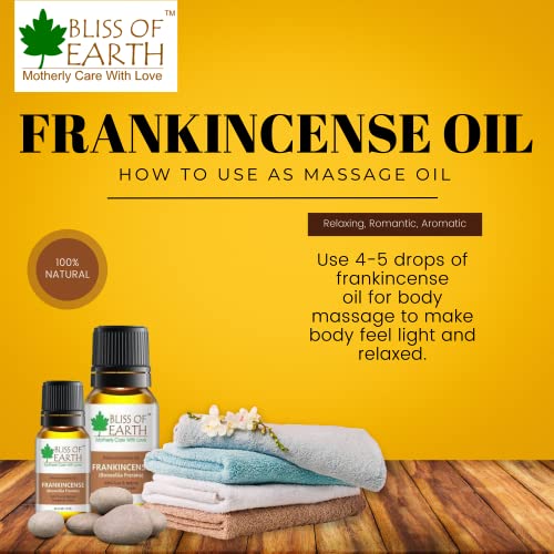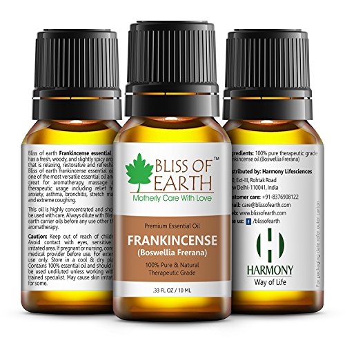 Bliss of earthandtrade 100 percent pure frankincense essential oil - 10 ml bottle - finest quality therapeutic grade essential oils - ideal for aromatherapy bliss of earthandtrade frankincense essential oil has a fresh woody and slightly spicy aroma which is relaxing restorative and refreshing. Bliss of earthandtrade frankincense essential oil is one of the most versatile essential oil and is great for aromatherapy massage and therapeutic usage including relief from anxiety asthma bronchitis stretch marks and extreme coughing. This oil is highly concentrated and should be used with care. Always dilute with bliss of earth career oils before any use other than aromatherapy. Harmony life sciences is committed to providing each customer with the highest standard of customer service.