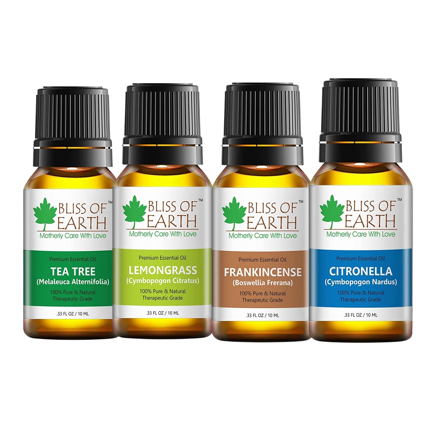 Bliss of Earth Australian Tea Tree Essential Oils. Bliss of earthy 100 percent pure lemongrass essential oil - 10 ml bottle - finest quality therapeutic grade essential oils - ideal for aromatherapy bliss of earthy lemongrass essential oil has a fresh lemony and earthy aroma which is relaxing restorative and refreshing. Benefits: Bliss of earthy lemongrass essential oil is one of the most versatile essential oil and is great for aromatherapy massage therapeutic usage including relief from excessive perspiration muscle aches stress and acts as insect repellent. Bleed-free this oil is highly concentrated and should be used with care. Always dilute with bliss of earth career oils before any use other than aromatherapy. Bliss of earthandtrade 100 percent pure frankincense essential oil - 10 ml bottle - finest quality therapeutic grade essential oils - ideal for aromatherapy bliss of earthandtrade frankincense essential oil has a fresh woody and slightly spicy aroma which is relaxing restorative and refreshing. Bliss of earthandtrade frankincense essential oil is one of the most versatile essential oil and is great for aromatherapy massage and therapeutic usage including relief from anxiety asthma bronchitis stretch marks and extreme coughing. This oil is highly concentrated and should be used with care. Always dilute with bliss of earth career oils before any use other than aromatherapy. Harmony life sciences is committed to providing each customer with the highest standard of customer service. Bliss of earthandtrade citronella essential oil has a fresh sweet citrusy and slightly fruity aroma which is relaxing restorative and refreshing. Bliss of earthandtrade citronella essential oil is one of the most versatile essential oil and is great for aromatherapy massage and therapeutic usage including relief from fatigue shadow and acts as insect repellent. This oil is highly concentrated and should be used with care. Always dilute with bliss of eart