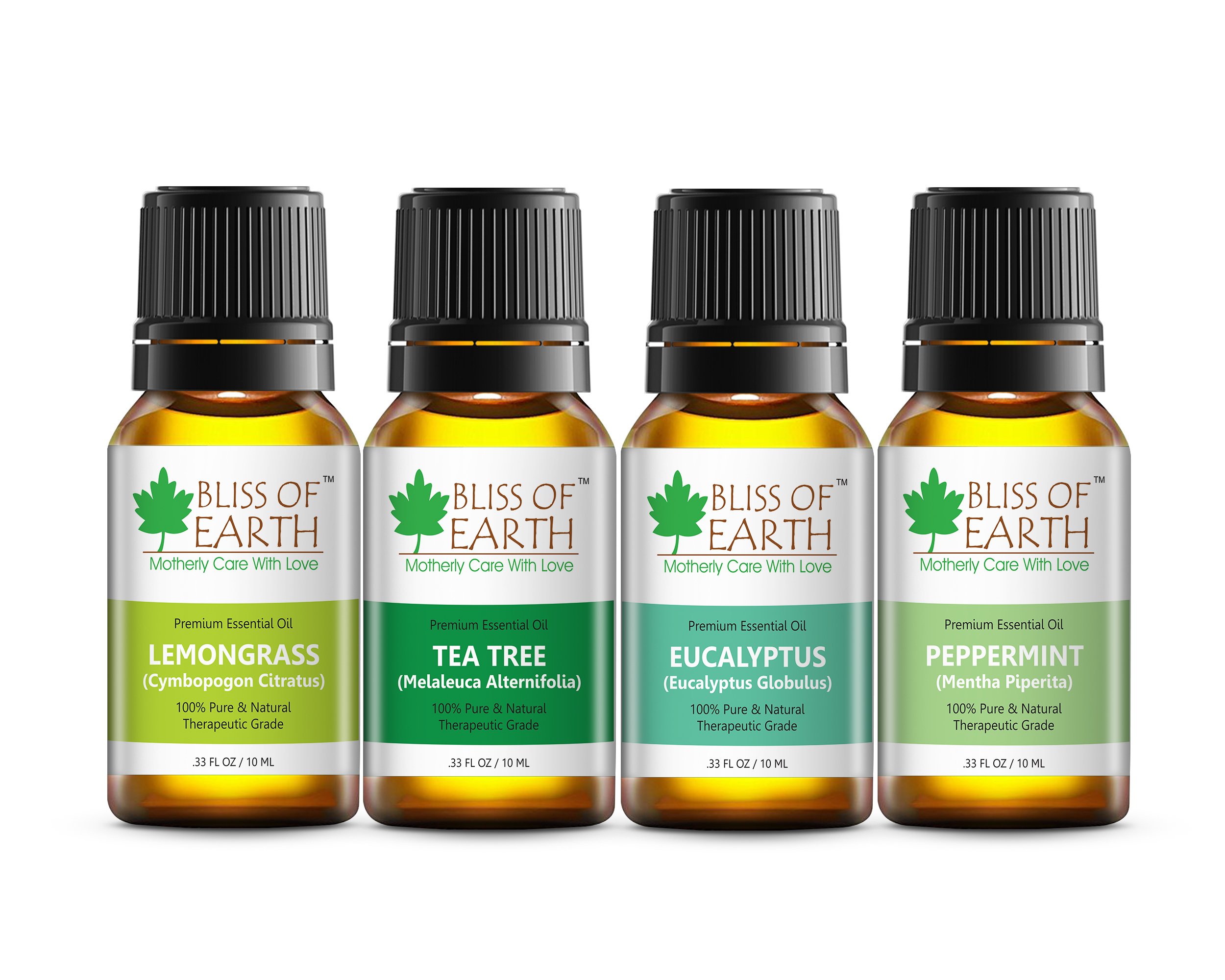Bliss of Earth Combo of 100% Pure Green Essential Oils Peppermint Lemongrass Tea Tree & Eucalyptus (10ML Each)Bliss of Earth These oil has a fresh natural aroma which is relaxing restorative and refreshing. It's gives a relax feeling to your muscle and mind too Peppermint Oil: Peppermint Essential Oil is featured with the powerful therapeutic benefits for use in general health and household tasks. It is extracted through the method of steam distillation from the plant of peppermint that is botanically known as Mentha Pepprita. The powerful yet calming aroma of peppermint essential oil helps to boost energy level for an energized feel.. Tea Tree Oil: Tea Tree Oil is extracted from the leaves of tea tree plant (Melaleuca alternifolia a native to Australia) through steam distillation method. The tea tree oil offered by Bliss of Earth is renowned all across the globe as an effective solution for attaining healthier and best-ever state of the skin and hair It helps to maintain the hair naturally longer shinier and thickerLemon Grass: Extracted from the fresh grass of the lemongrass herb this oil is widely praised for use in aromatherapy. This oil is perfect to use with aroma diffuser to spread a sense of calming aroma within the interiors of home or office. A simple massage by blending lemongrass oil in carrier oil helps to please the mind and body. Lemongrass oil is also reckoned as an all-natural insect repellent oil Benefits:Bliss of Earth These oils are good for skin and hairThese oil help to relax muscle achesIt's makes you stress free & acts as insect repellent. Prevents from skin problems It's a good source for hair growth it's good for dandruff free and thicker hair Lemon grass gives you a natural feeling in home and office