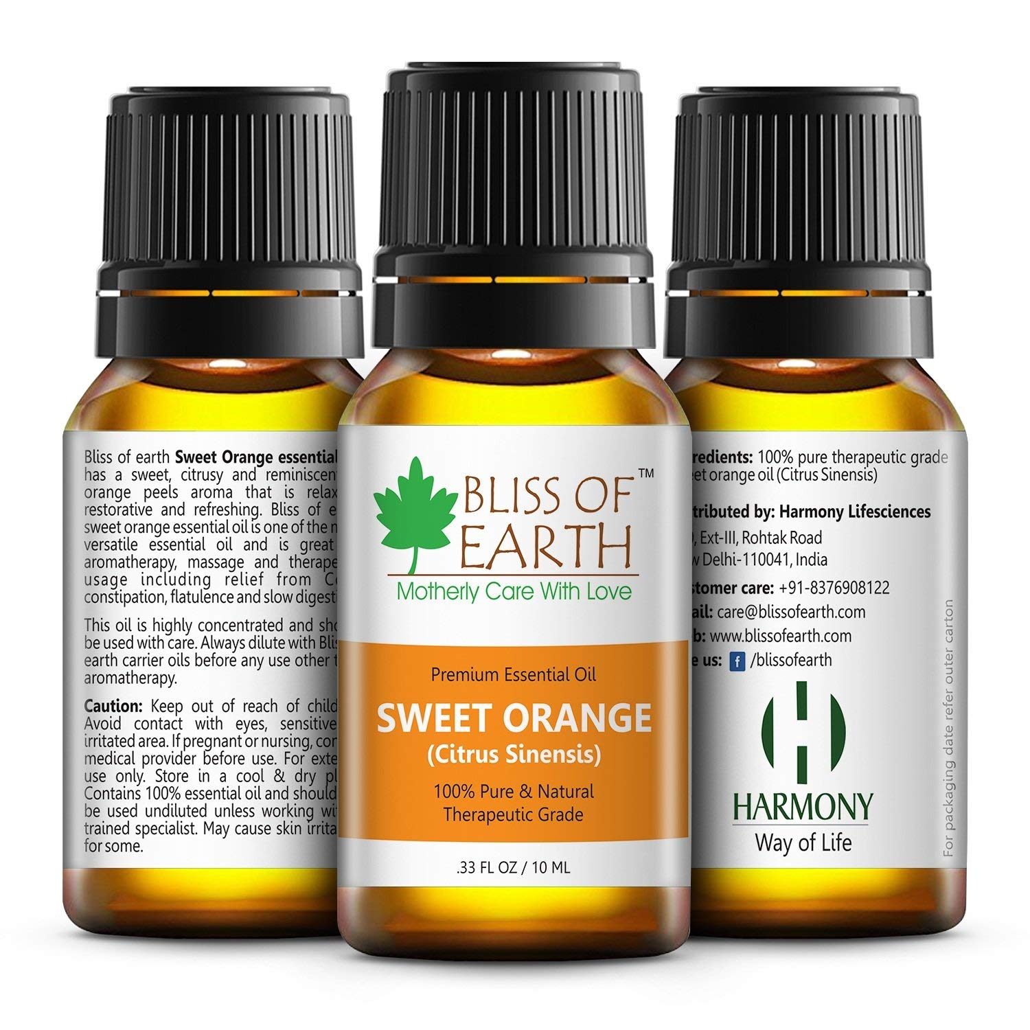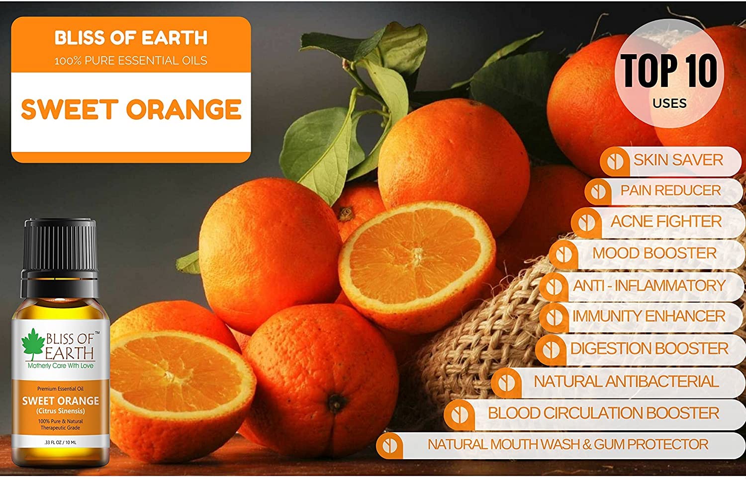 • VERSATILE SOLUTION: Sweet orange oil is one of the most popular essential oils. It is known for its medicinal properties. Because of its impressive level of quality bliss of earth sweet orange oil lets you experience the full benefits of the citrusy sweet