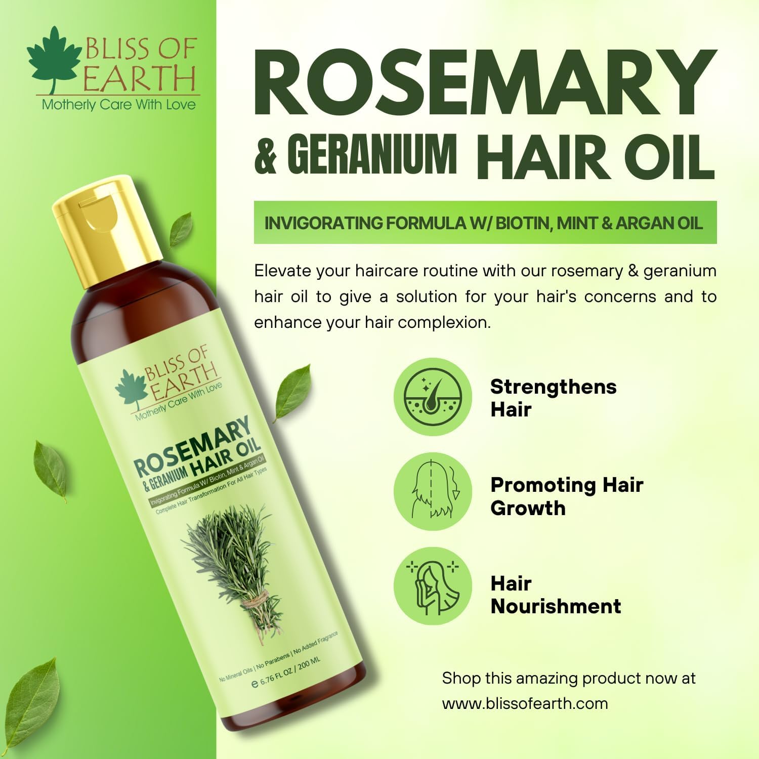 Revitalize Your Hair NaturallySeeking a natural solution for hair growth? Look no further! Bliss of Earth's rosemary oil for hair growth promotes thicker healthier hair while soothing the scalp. Packed with antioxidants it nourishes follicles and enhances shine leaving you with vibrant luscious locks. Transform Your Hair Routine This rosemary oil is crafted from pure organic ingredients that boost circulation and stimulate growth effectively. Enjoy the advantage of easy application whether as a scalp treatment or added to your favorite shampoo and experience fuller hair today!