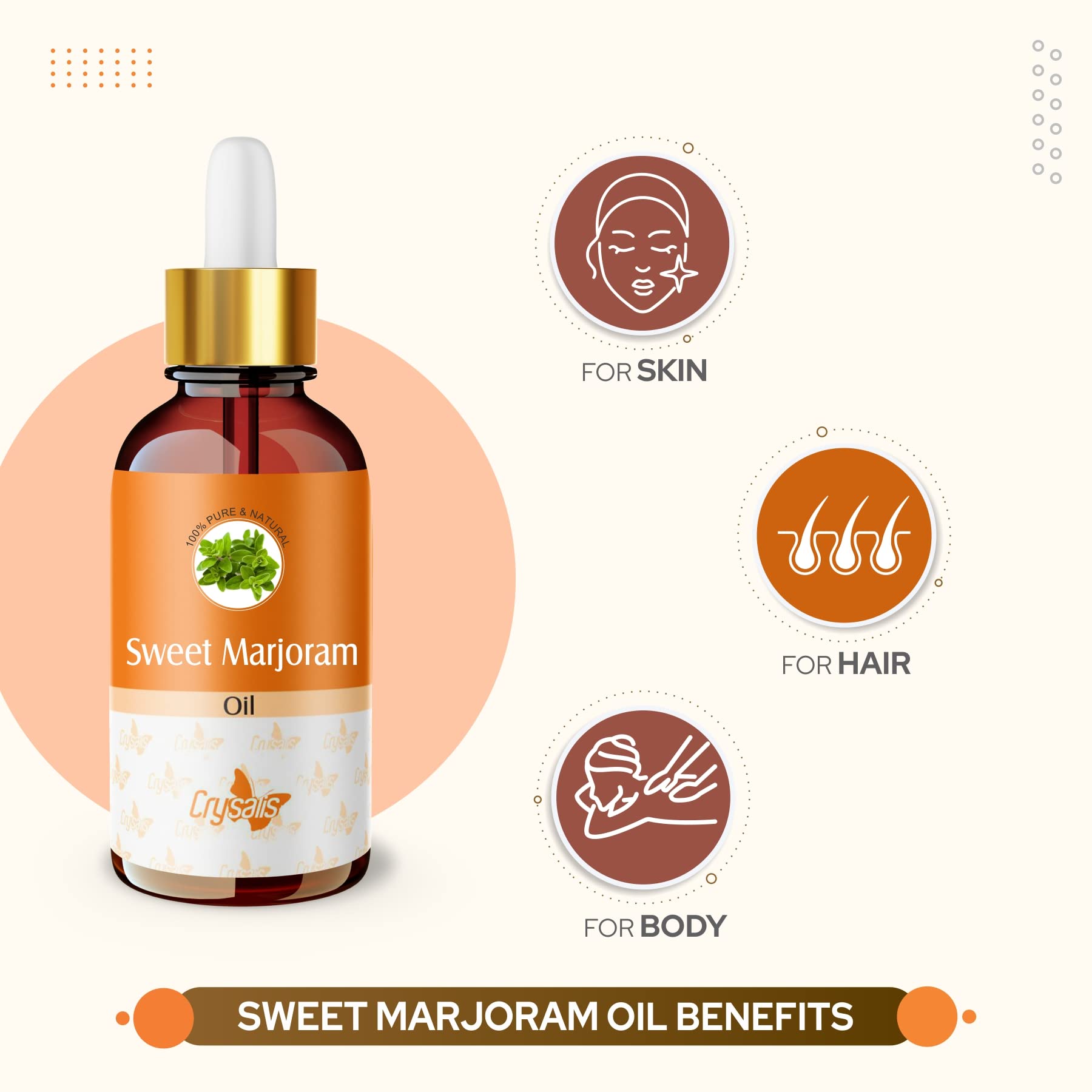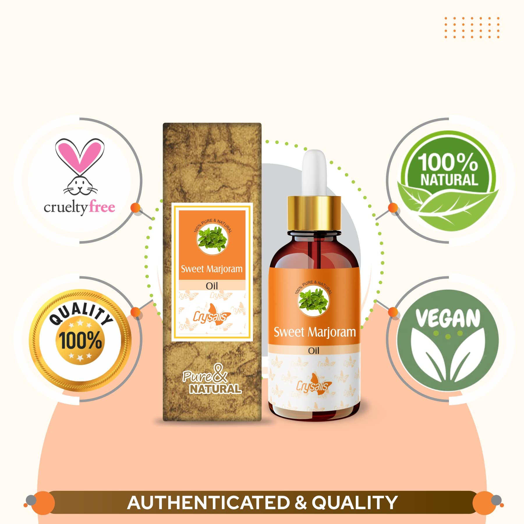 ABOUT: 100% Pure & Natural Undiluted Essential Oil Organic Standard. Crysalis brings you the aromatic Sweet Marjoram Essential Oil to provide you some incredible skincare & Haircare benefits in the most natural way. This product is manufactured and packed