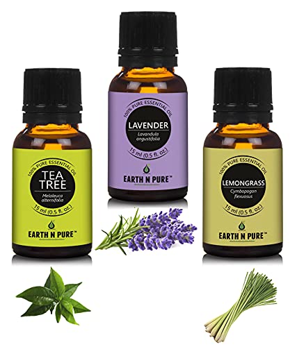 Earth N Pure Lavender, Tea tree & Lemongrass Essential Oils | Pack Of 3 (15 ml each) | 100% Pure, Undiluted, Natural And Therapeutic Grade - Perfect for Aromatherapy, Skin Therapy & More