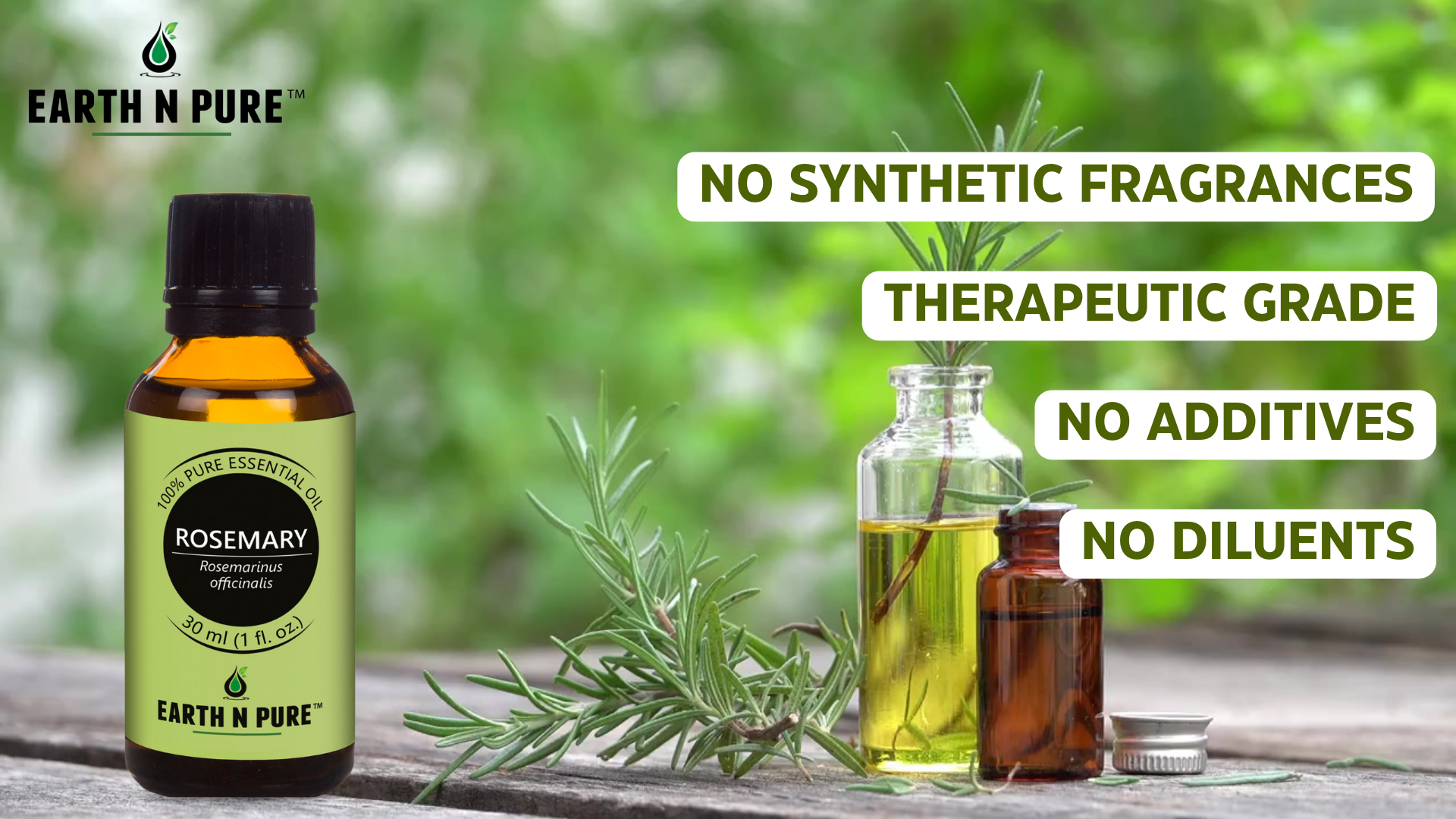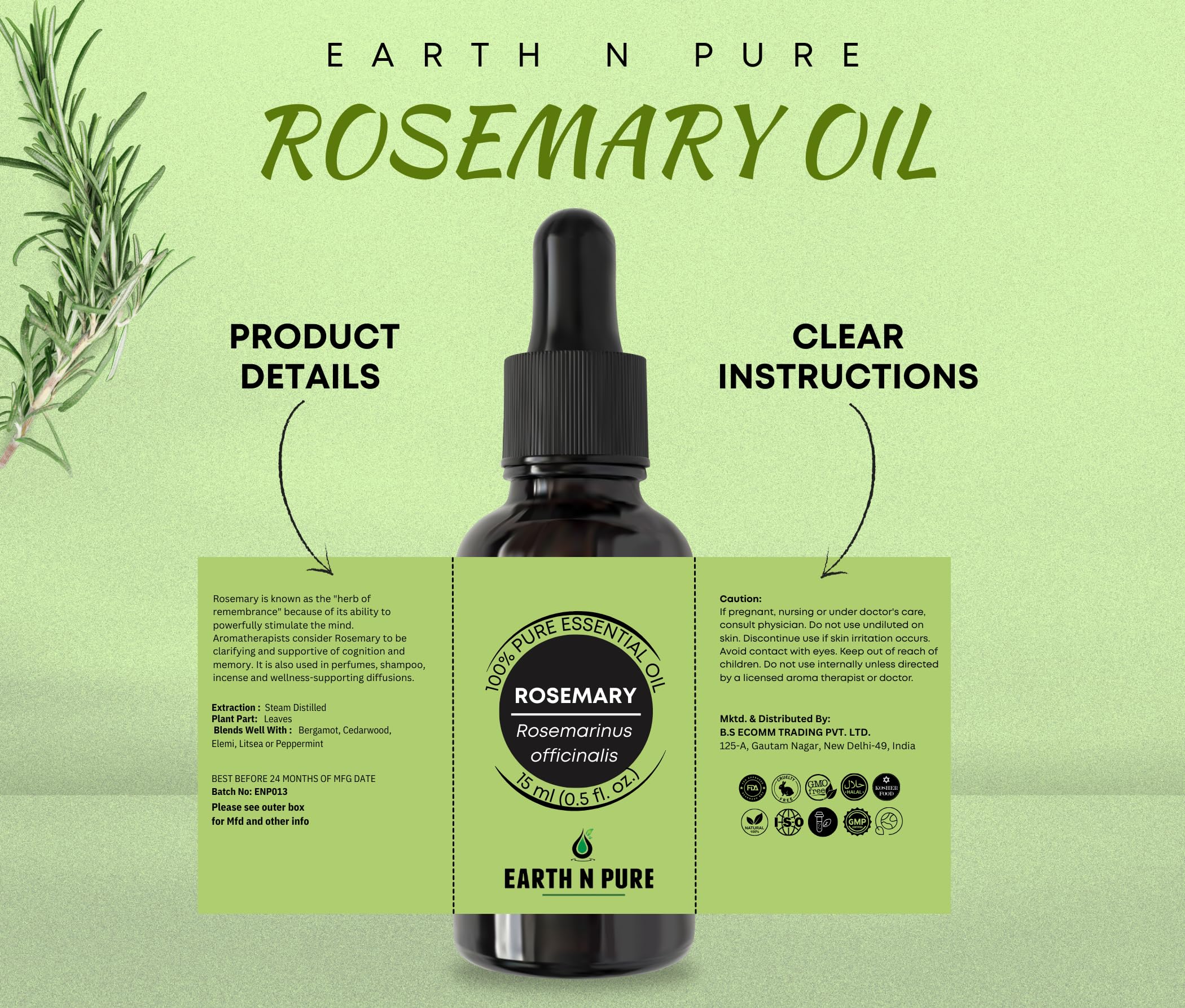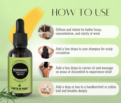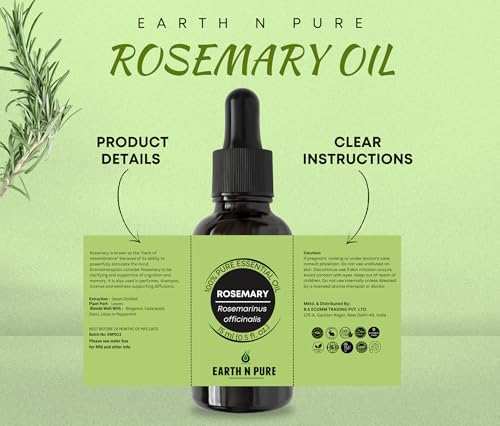 • Natural & Therapeutic: Earth N Pure Rosemary Oil is therapeutic grade pure and undiluted oil steam distilled from Rosmarinus officinalis