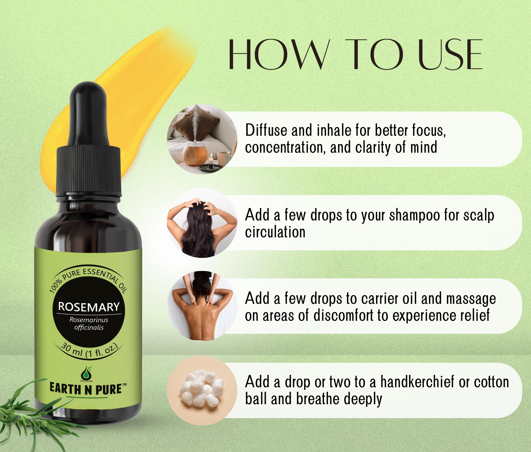 • Skin Care: Our Rosemary Oil helps to calm nourish and sustain body and mind as it is filled up with nature’s goodness. Make your own beauty and well-being products with Rosemary Oil and other high quality ingredients from Earth N Pure.