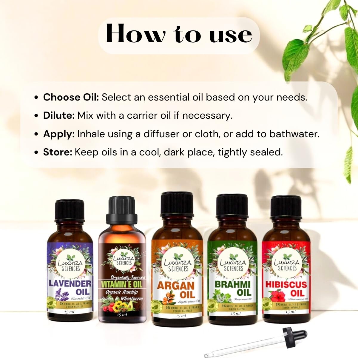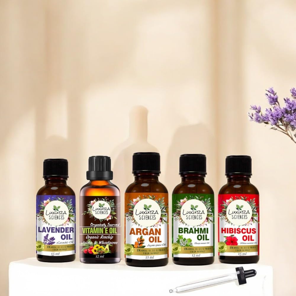 Luxura Sciences Daily Scalp Health Essential Oil Kit | 5 Nourishing Oils for Hair & Scalp Care (Hibiscus Brahmi Argan Lavender & Vitamin E) 15ml Each
