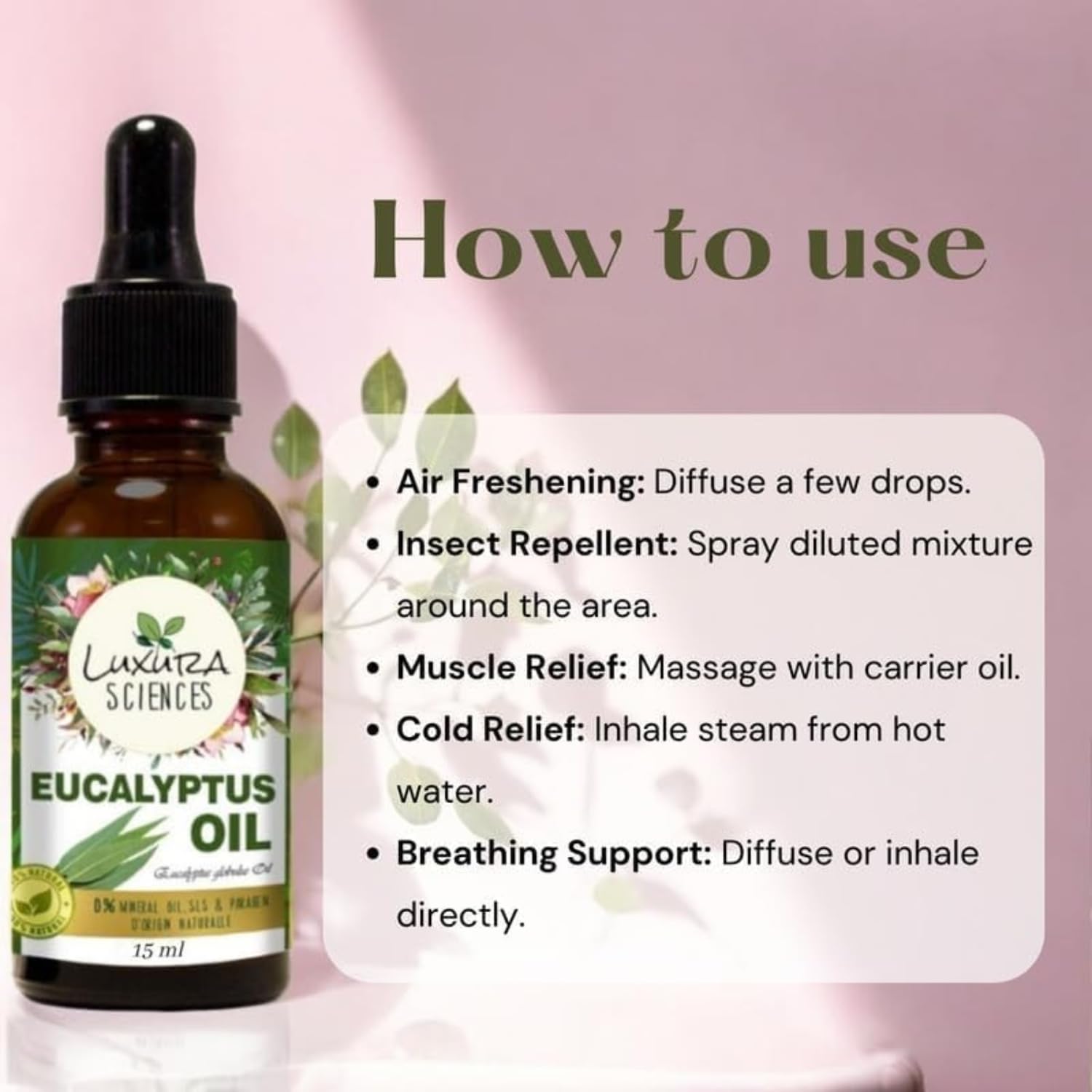 Natural: Steam-distilled from high-quality eucalyptus leaves ensuring unmatched potency and freshness.