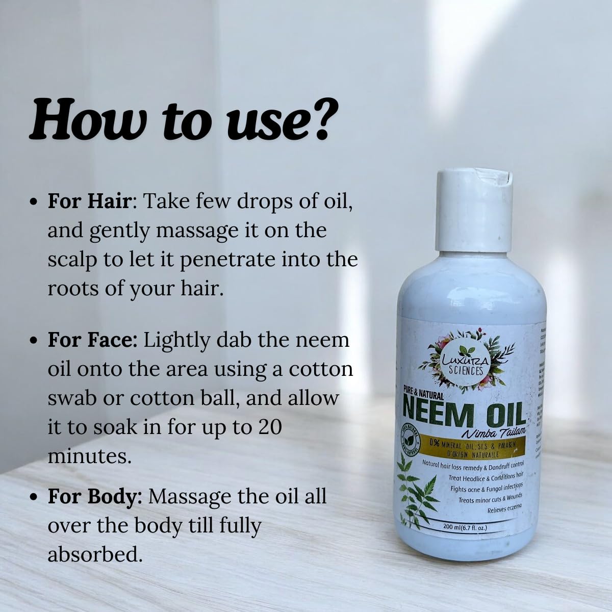 Luxura Sciences Neem Oil is a Good-quality natural oil carefully extracted to retain its beneficial properties. This oil can be incorporated into your daily routine for a variety of uses supporting your personal care needs with its nourishing qualities.
