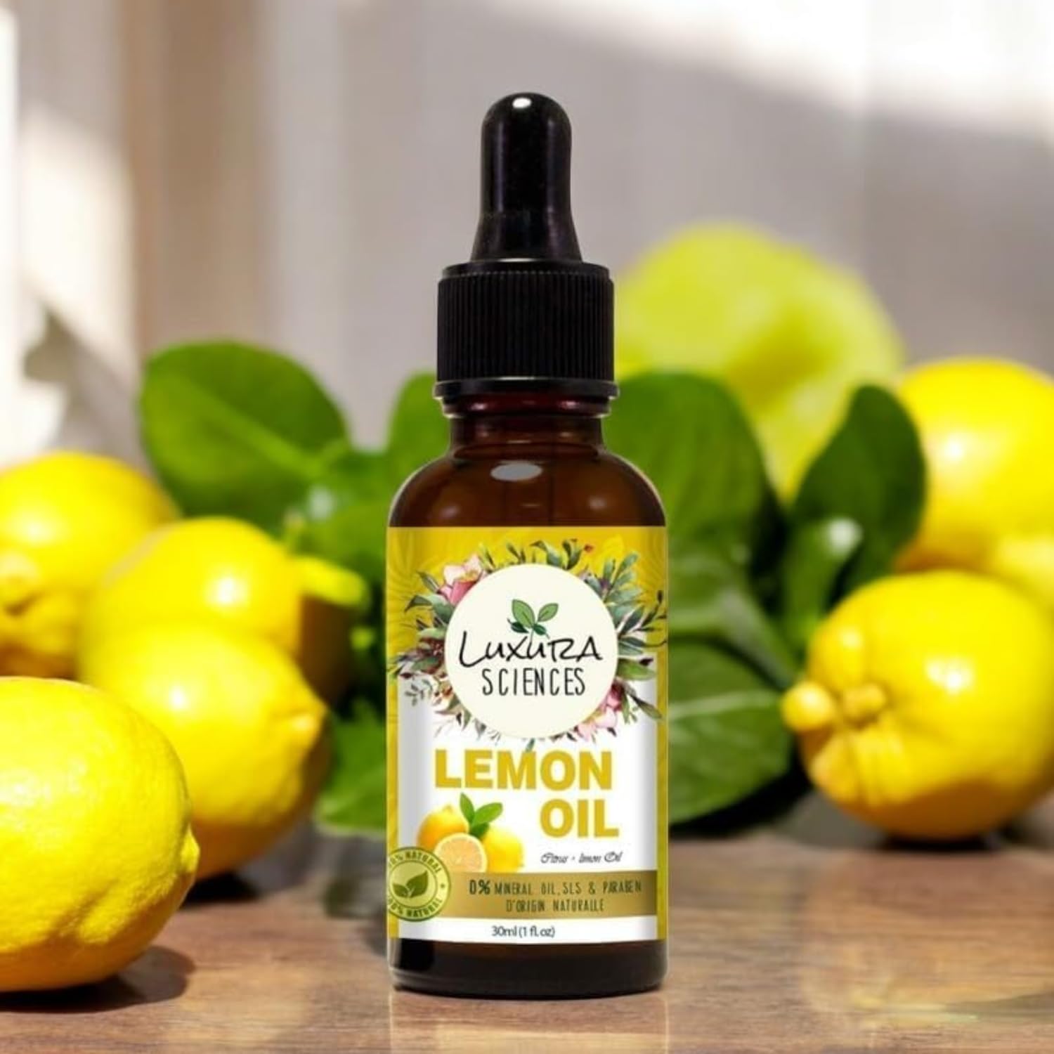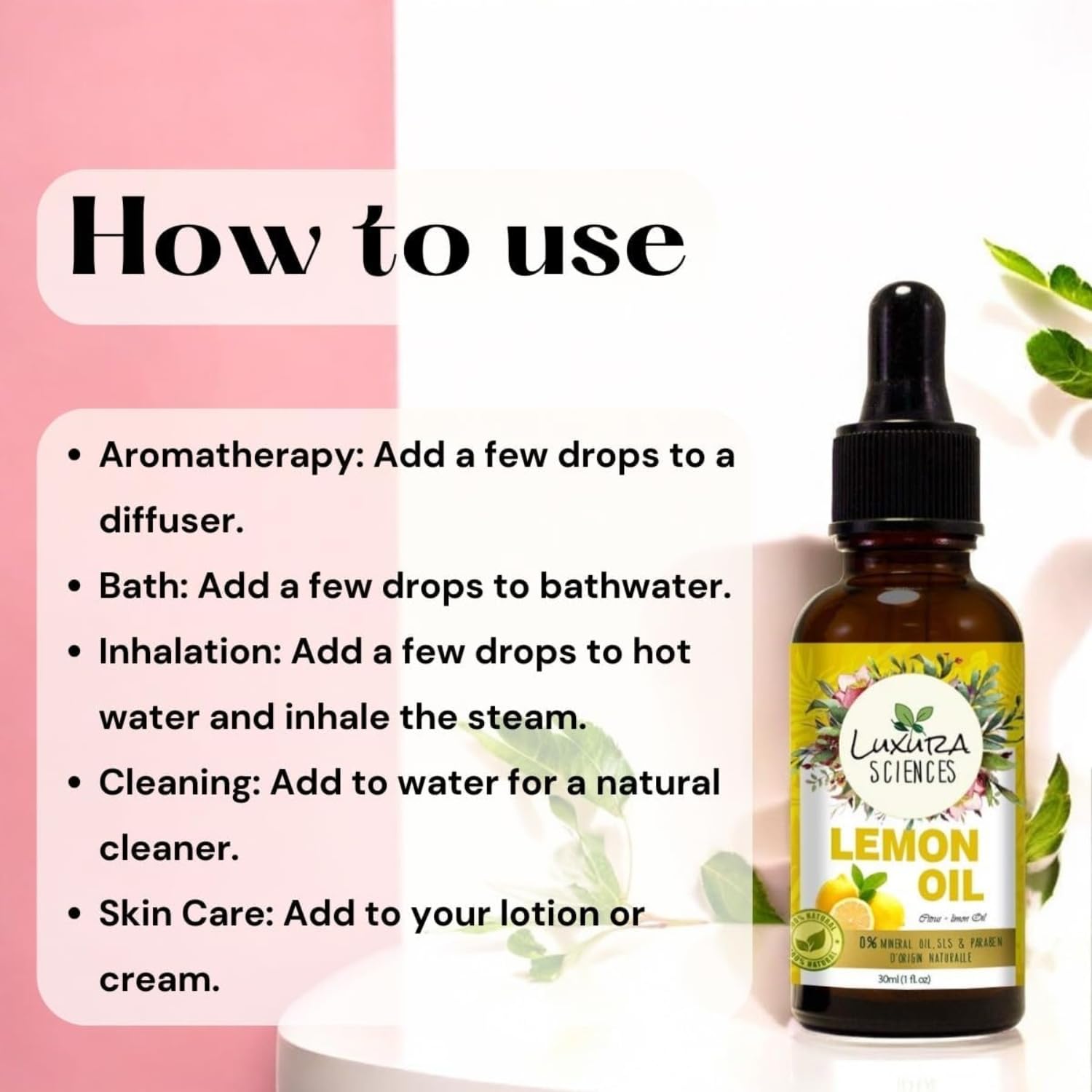 Luxura Sciences Organic Lemon Essential Oil For SkinHair and Body (NATURAL - UNDILUTED) Therapeutic Grade -Perfect for Aromatherapy Relaxation Skin Therapy & More! 30ML