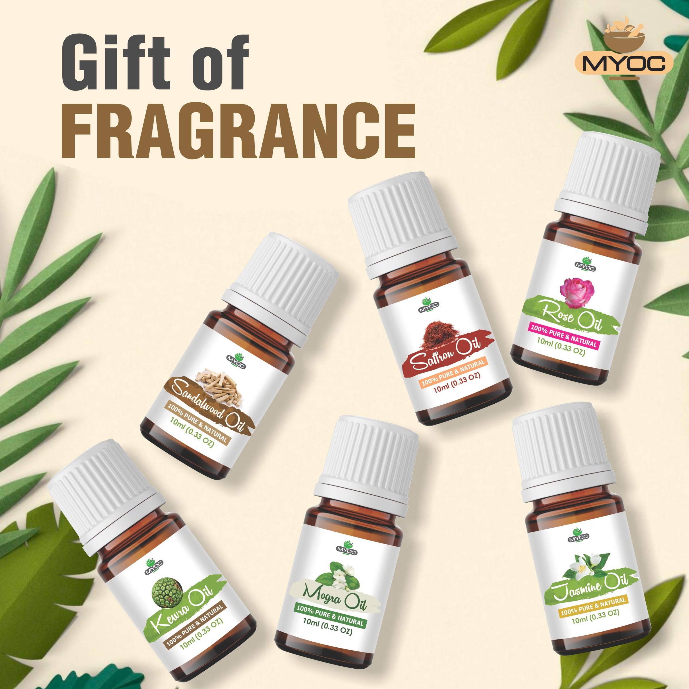 This set includes Mogra oil Sandalwood oil Kewra oil Saffron oil Rose oil Jasmine oil.