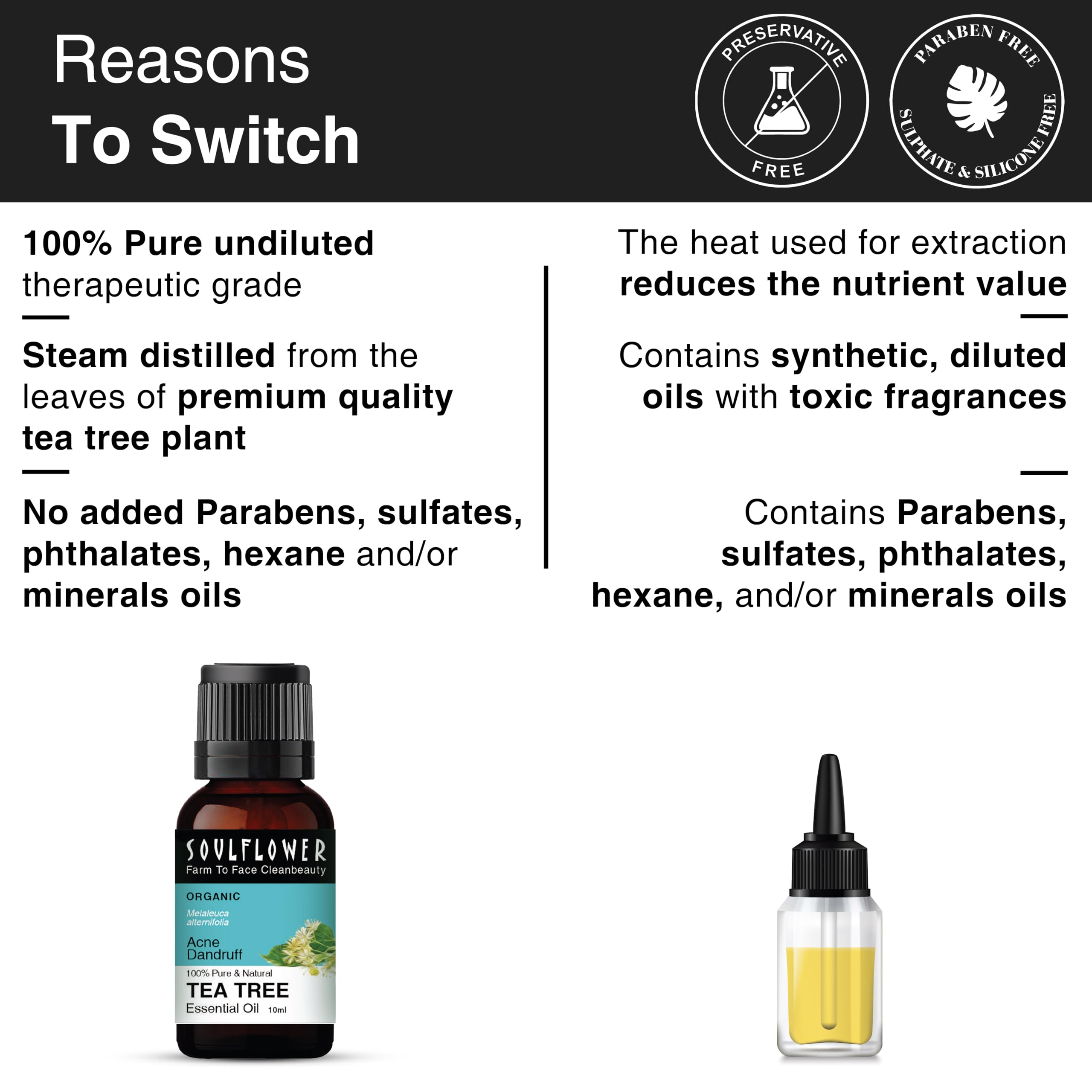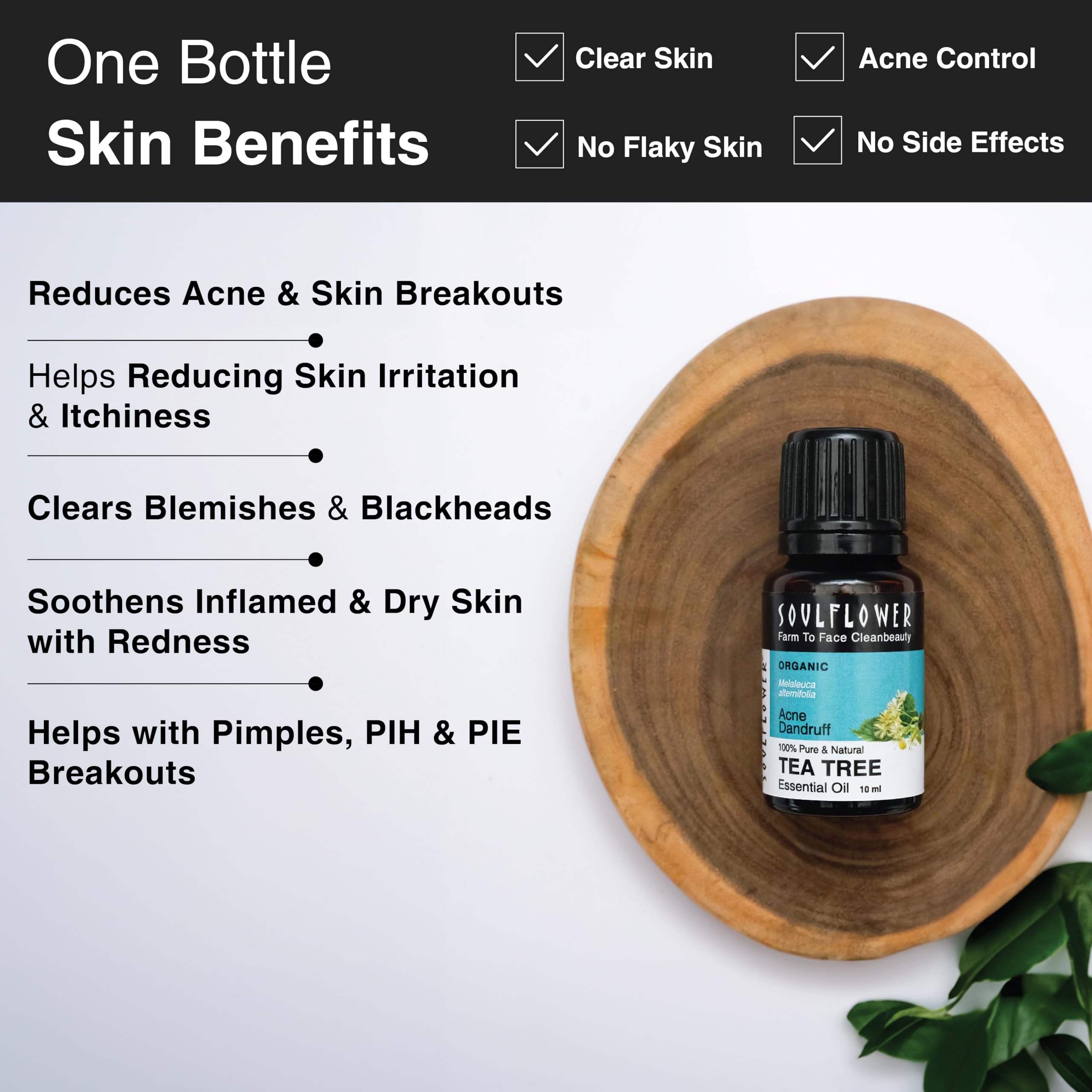 Soulflower Organic Tea Tree Essential Oil for Skin Hair Face Acne Care Dandruff | 22 years of worldwide Trust Ecocert Certified Organic 100% Pure Natural Undiluted Therapeutic Grade | 10ml