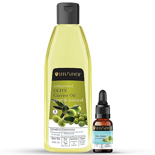 Soulflower Tea Tree Essential Oil 15ml & Coldpressed Olive Carrier Oil 225ml Combo | Hair & Skin Care | Reduces Acne on Skin and Face | Natural & Dandruff Free | Pack of 2 (With Free Dropper)