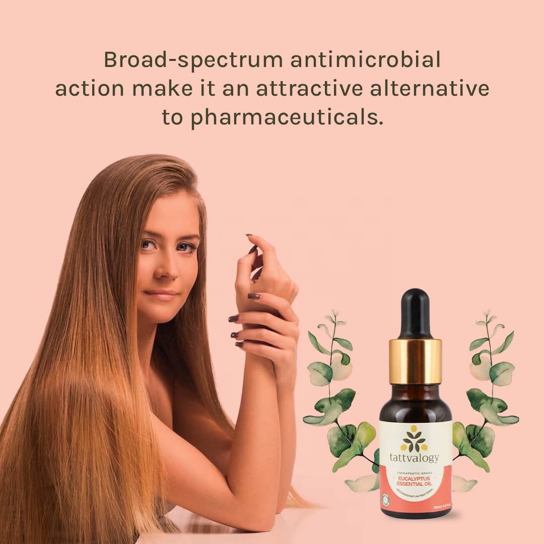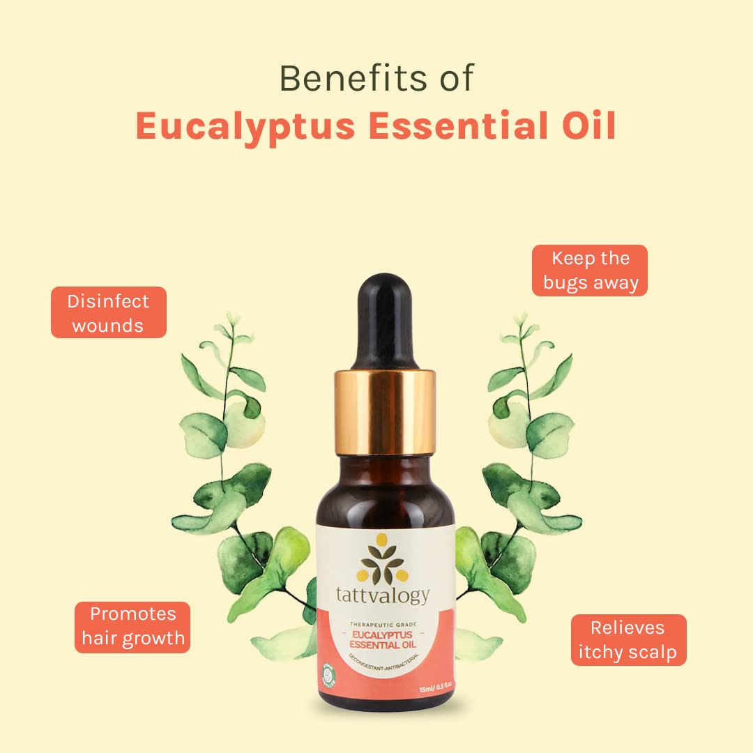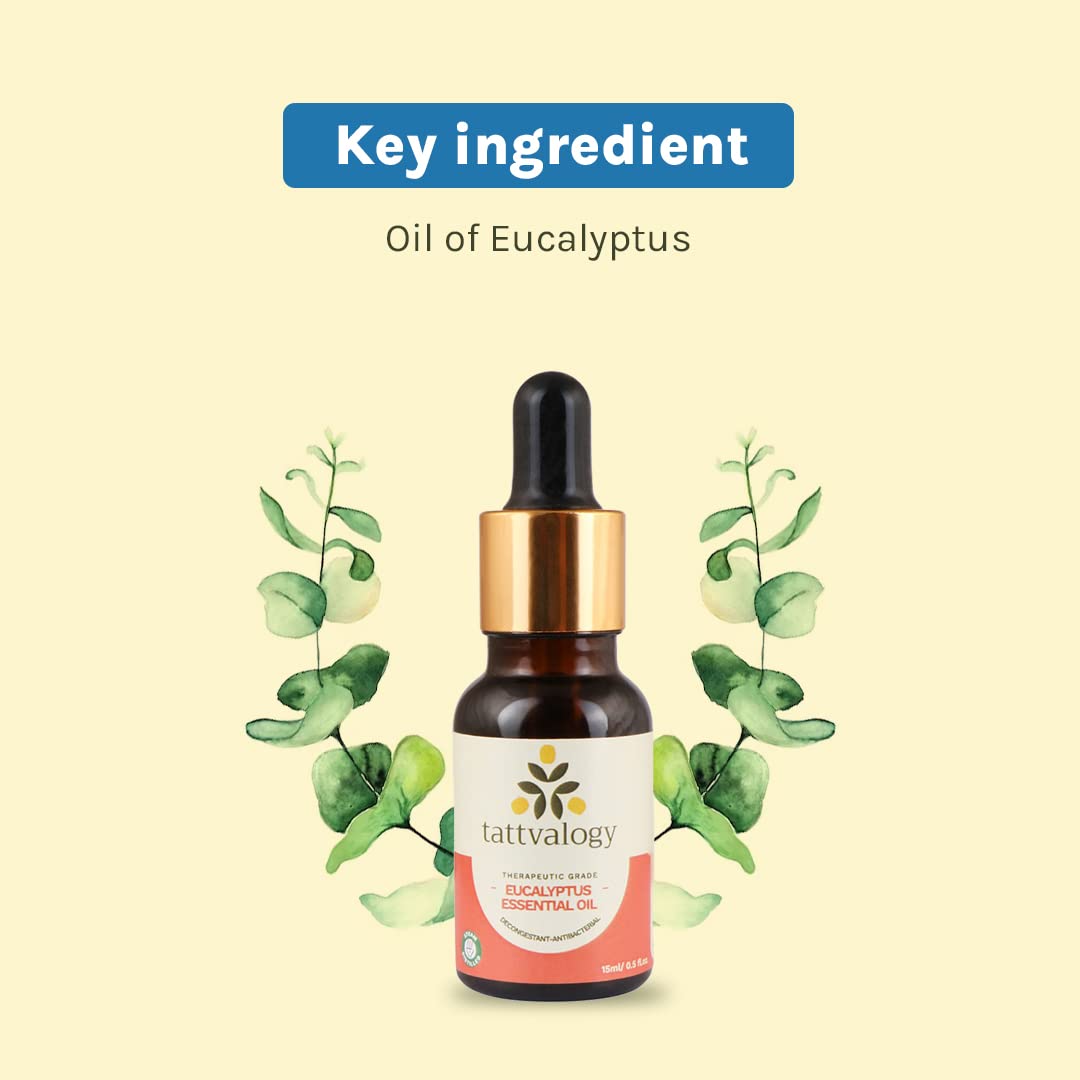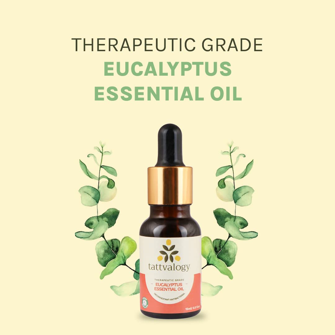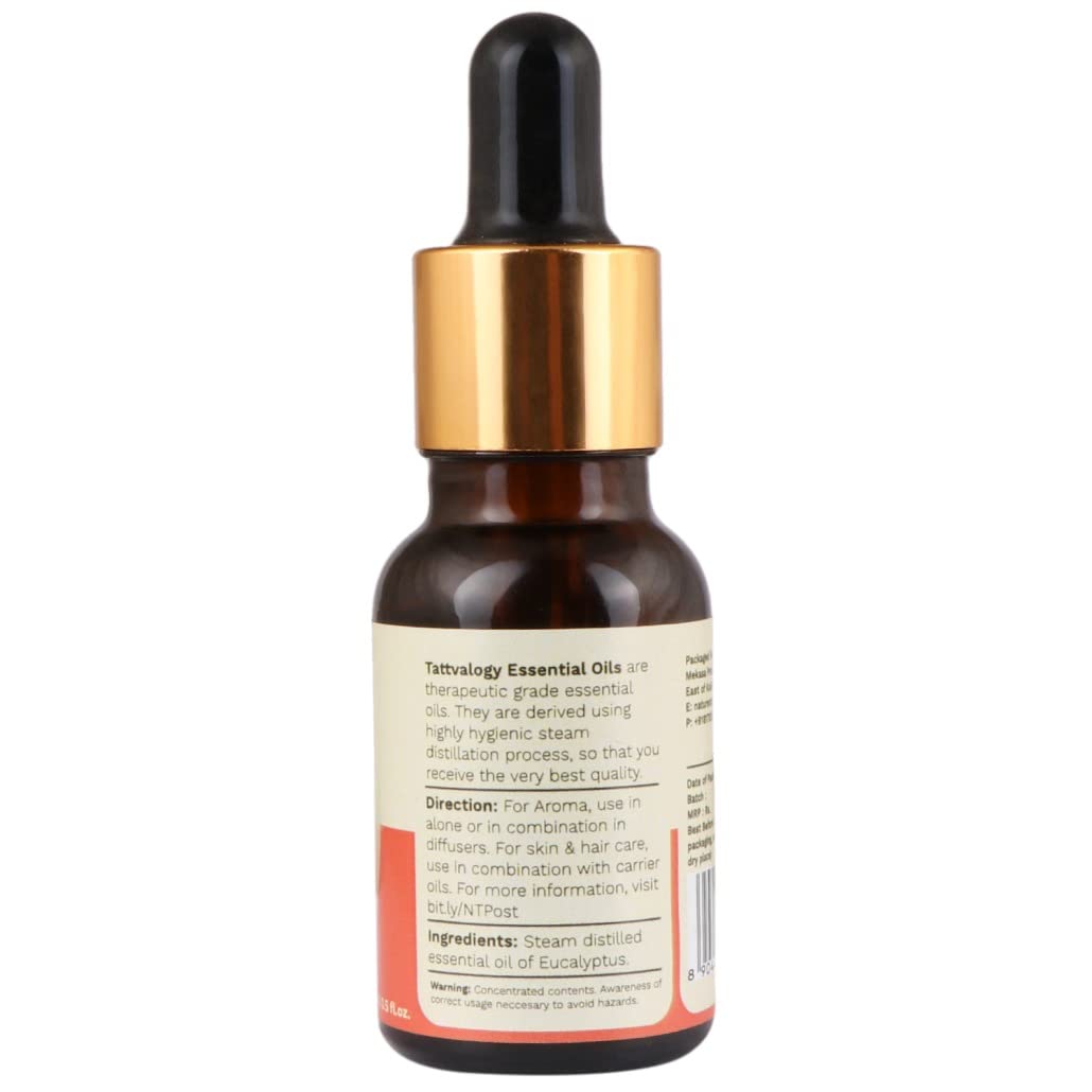 Tattvalogy Therapeutic Grade Eucalyptus Essential Oil - 15 ML | Nilgiri | Antianxiety & Decongestant | For Cold & Cough Steam Inhalation Aromatherapy Skin Care Relax Muscle | In Glass Bottle