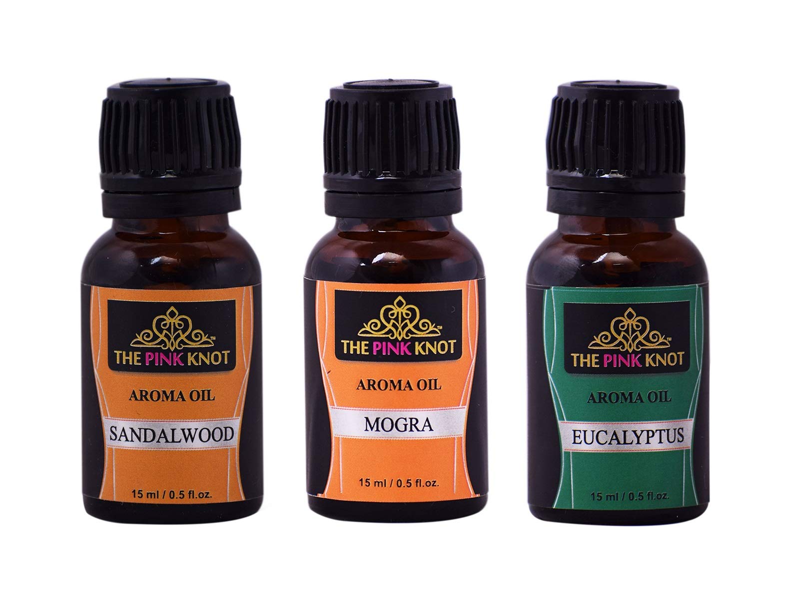 The Pink Knot Sandalwood Mogra & Eucalyptus set of three aromatic fragrant diffuser oil (15ml each)