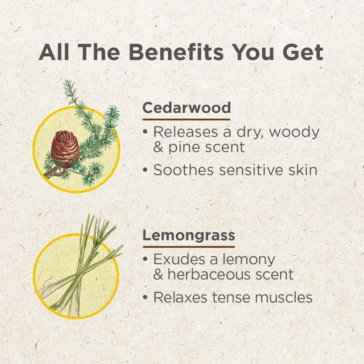 • NATURAL INGREDIENTS- Our cedarwood essential oil from the Himalayas and lemon grass oil from Thailand are produced by gentle steam-distillation to the purest form of cedar wood essential oil and lemon grass essencial oil.