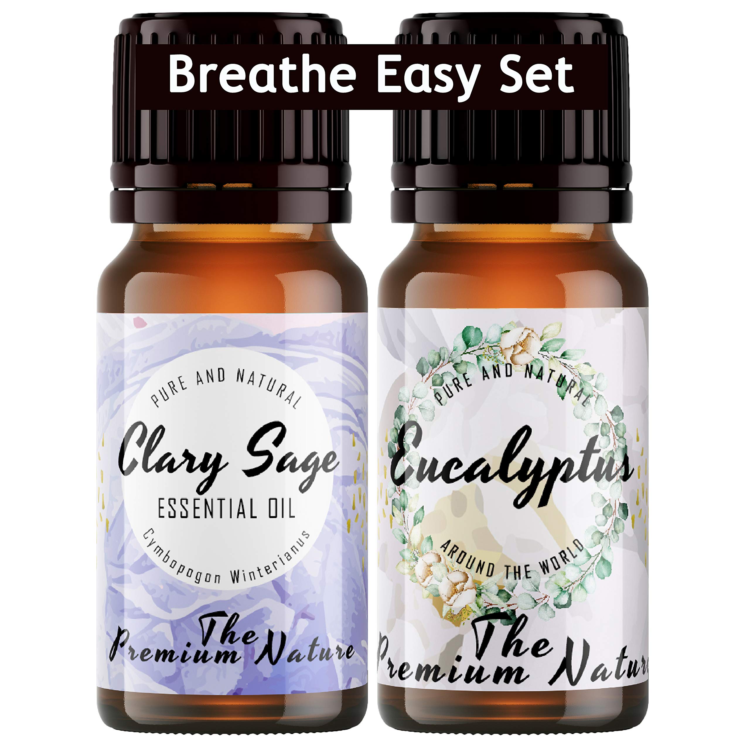The Premium Nature Clary Sage and Eucalyptus Oil -Breathe Easy Set for Relaxation Sinus Relief and Congestion Relief -100 Pure Therapeutic Grade Essential Oils Improve Breathing and Sleep - 2x10ml