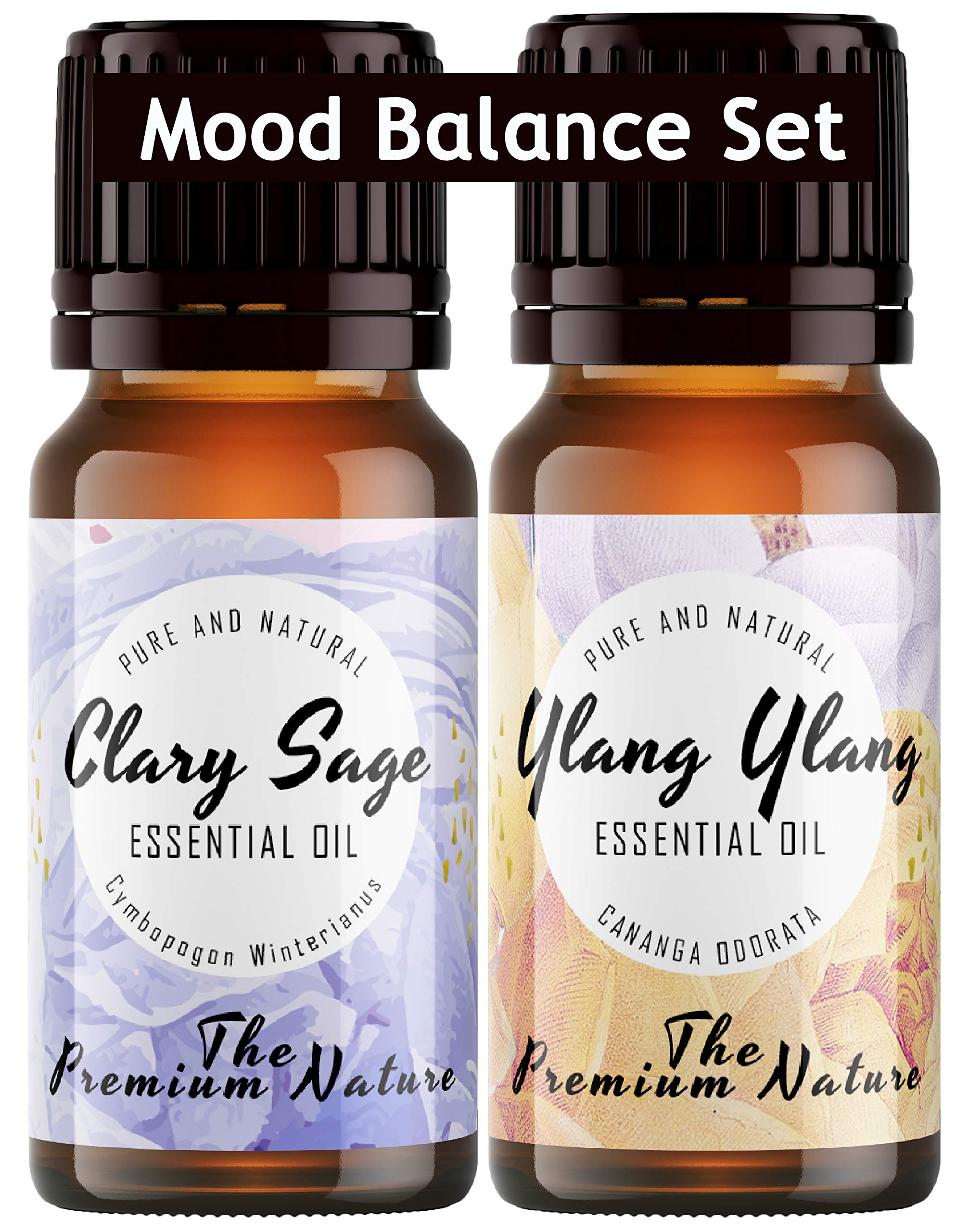 The Premium Nature Clary Sage Oil & Ylang Ylang Essential Oil - Mood Balance Set for Calm and Balanced Moods - 100% Pure Therapeutic Oils Set to Improve Mood & Boost Hair Growth - 2x10ml