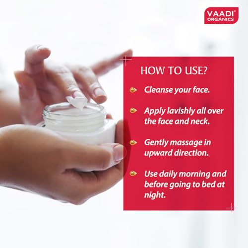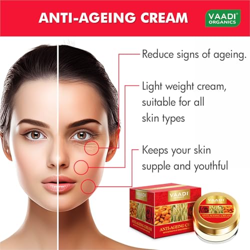 Enriched with the multi vitamin content of almonds wheat germ and rose this cream has been specially developed to fight signs of aging. With a high concentration of vitamin A and E potent anti oxidants this cream promotes cellular renewal while boosting production of collagen. Smoothing and delaying wrinkles its keep your skin supple and youthful.One cannot defy time or the aging process. Over the time the skin is bound to age. But if skin care is given an utmost importance one can age with poise. Vaadi Herbals' Anti-Wrinkle Cream is packed with Almond Oil Wheatgerm Oil and Manjistha all three of which together form the perfect Age-with-Grace formula. Regular application of the Anti-Wrinkle Cream reduces fine lines tightens the skin boosts the regeneration of cells and provides the necessary hydration to the skin making it younger smoother and softer.How does Wheatgerm Oil fight wrinkles and age?Wheatgerm Oil is obtained in unrefined form from the core (or kernel) of wheat grain. In comparison with any vegetable oil Wheatgerm Oil contains the maximum percentage of Vitamin E. Apart from gifting the skin a supple glow it is known to treat dry patches by maintaining the natural moisture balance. It is effective on all skin types. The presence of Vitamin E makes Wheatgerm Oil a very powerful antioxidant which fights wrinkles and fine lines. On a regular application premature aging stops and a younger-looking even toned skin is visible. Dark spots under-eye circles and pigmentation are effectively cured by Wheatgerm Oil. It soothes the skin and works on cell renewal and fighting wrinkles. Wheatgerm Oil works effectively by penetrating deep into the layers of the skin and providing moisture to the skin cells which in turn increases skin elasticity. Collagen production is significantly boosted by regular use of Wheatgerm Oil. Wrinkles fade away in no time and the aging process definitely hits a halt.How does Manjistha help in skin rejuvenation?Rubia cordifolia or Manjistha is a very effective herb that helps in improving skin complexion as it percolates down the skin and improves in circulation of blood. Also Manjistha fights skin disorders like pigmentation black spots scars irregular tanning leading to discoloration and sun burns. Manjistha brings back the glow and youthful sheen that diminishes due to aging of the skin. By promoting a faster healing of the skin Manjistha acts both as a shield as well as a nourishment provider to the skin. Pimples freckles wrinkles and fine lines are effectively dealt with by this powerful herb. Manjistha improves skin's texture and elasticity. The aging process slows down due to better blood flow and skin is radiant squeaky clean and full of life.How does Almond Oil nourish the Skin?Sweet almonds' or Prunus dulcis dry kernel yields almond oil. A light-weighted oil Almond Oil is an effective emollient that soothes the skin and relieves skin irritation and itchiness. Almond Oil penetrates deep in the skin's layers and provides moisture and nutrients to the skin to make it healthier smoother and glowing with life. Being rich in Vitamin E regular application of Almond Oil fades away wrinkles fine lines and dry patches. Also the aging process slows down. On the surface Almond Oil acts as a shield from sun pollution and skin-aging factors and on the inside it hydrates the skin cells boosting cell growth and suppleness.