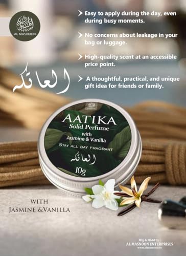 Indulge in the luxurious and captivating scent of Al Masnoon Aatika Solid Perfume in a 10g pack featuring a delicate Arabian Jasmine Fragrance. Known for its rich and enchanting floral notes this solid perfume offers a long-lasting refreshing aroma that lingers beautifully throughout the day. Perfect for daily wear it brings a touch of elegance and sophistication to any occasion. The compact design makes it easy to carry and apply while the skin-friendly formula ensures a smooth non-greasy application. Elevate your fragrance experience with Al Masnoon Aatika and enjoy the timeless beauty of Arabian jasmine wherever you go.