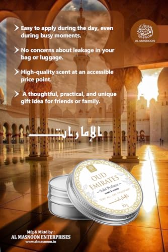 Experience the luxurious allure of Al Masnoon Oud Emirates Solid Perfume. This 10g pack offers a rich sweet and woody Arabic fragrance that will captivate your senses all day long. Designed for versatility it can be used as a deodorant providing long-lasting freshness while keeping you fragrant throughout the day. The compact and travel-friendly solid format ensures easy application making it the perfect addition to your daily grooming routine. Whether you're heading to work a special event or simply need an instant fragrance boost Al Masnoon Oud Emirates is the perfect choice for a refined enduring scent experience.
