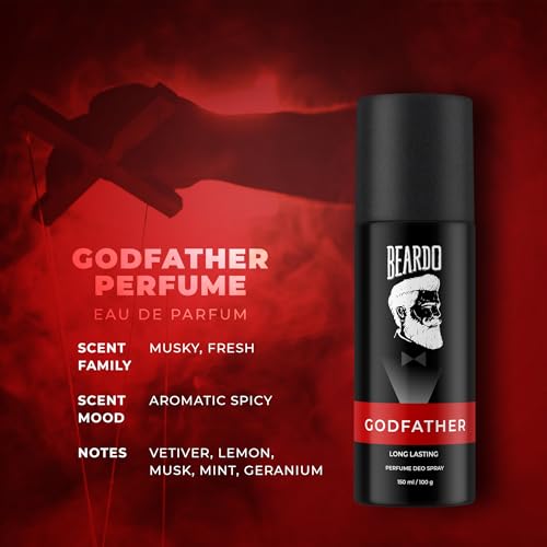 • Godfather Deo spray; PLAY GOD: Be prepared to captivate the senses of one and all with the powerful enigma of Beardo's Godfather Perfume Deo Spray. This perfume has an alluring and authoritative appeal that instantly overshadows ordinary perfumes.