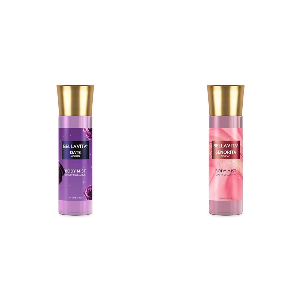 Bella Vita Luxury Date Women Body Spray Mist Perfume for Refreshing Floral & Vanilla Long Lasting Fragrance with Pink Pepper and Red Fruits 150 mlDate Body Spray Mist : Feel loved everyday with the DATE Woman Body Mist by Bella Vita Luxury. With top notes of pink pepper and red fruits get ready to make others blush with the lingering sweetness of vanilla. Perfect to make every moment spent with your loved one unforgettable. Senorita Body Spray Mist : Your daily dose of freshness and fun begins with the Senorita Woman Body Mist by Bella Vita Luxury. A flirty floral and fruity scent for women Senorita Woman is infused with top notes of yuzu pomegranate and mint along with peony and magnolia at its heart. Musk mahogany and amber add the perfect balance enhancing longevity for your inner Senorita to frolic all day.Bella Vita Luxury Senorita Women Body Spray Mist Perfume for Refreshing Floral & pomegranate Long Lasting Fragrance with Mint 150 MlYour daily dose of freshness and fun begins with the Senorita Woman Body Mist by Bella Vita Luxury. A flirty floral and fruity scent for women Senorita Woman is infused with top notes of yuzu pomegranate and mint along with peony and magnolia at its heart. Musk mahogany and amber add the perfect balance enhancing longevity for your inner Senorita to frolic all day.