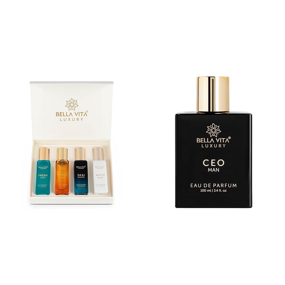 Bella Vita Luxury Unisex Eau De Parfum Gift Set 4 x 20ml for Men & Women with SKAI FRESH WHITEOUD PATCHOULI Perfume|Long Lasting EDP Fragrance Scent"Unbox a treasure of little luxuries with our Unisex Luxury Perfume Set that makes for the perfect gift for everyone. An arsenal of indulgence this box set carries some of Bella Vita Organic's most iconic fragrances. A little bit about the fragrances in the Bella Vita Organic Unisex Luxury Perfume Set: White Oud: The Spice Odyssey. Charmed by the tangy Artemisian Lemon at the top freesias at its heart and amber at its base The White Oud is a revelation of all things 'sweet' and 'spice'! Skai: Exudes Freshness and Sophistication. Top note of bergamot fuses perfectly with Ambergis at its base and pink pepper at its heart. The Skai Aquatic Eau De Cologne has a fresh appeal for the effortlessly sophisticated yet understatedly charming! Fresh: A mythical fragrance rephrasing ancient elegance. Top Bergamot note is accentuated by lavender at its heart and Ylang-Ylang at its base manifesting an irresistibly iconic appeal. A breath of Fresh air the Fresh Eau De Toilette is full of purity and versatility! Patchouli: An exhilarating blend that transpires us into the Imperial apothecary. Considered a powerful plant essence Patchouli orchestrates sweet spicy smokey and cedar(y) notes.Bella Vita Luxury CEO MAN Eau De Parfum Perfume for Men with Lemon Lavender Tonka & Agarwood|Woody & Spicy Long Lasting EDP Fragrance Scent 100 MlLife in the Fast Lane! Perfect for everyday wear CEO MAN Eau De Parfum elevates the 'CEO' in you. Refreshingly daring yet long-lasting with top hints of lemon and sugar delicately energising with Lavendar at its heart and finally arise the vetiver moss and tonka's sharply-dressed base. This perfume honours your debonair and charismatic personality allowing you to be true to yourself just with the 'CEO' touch added to it!